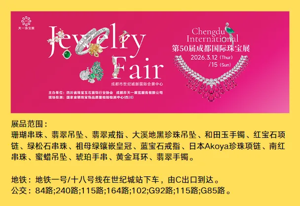 成都国际珠宝展览会(简称:成都珠宝展),定于2026年3月12-15日,在成都世纪城新国际会展中心举行!本届展会将汇聚来自世界各地和国内各省市的珠宝制造商、批发商、零售商、加盟商以及珠宝设计师、鉴定师现场进行新品展示,传递珠宝界时尚信息,共同打造珠宝行业时尚与奢华的璀璨盛会。
