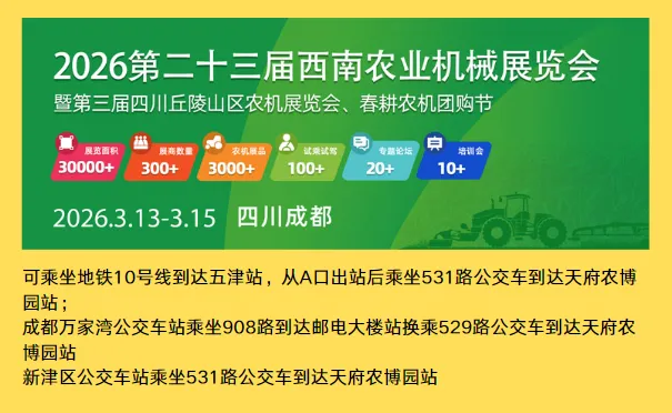 2026第二十三届西南农业机械展览会暨第三届四川丘陵山区农机展览会、春耕农机团购节将于2026年3月13-15日在成都·中国天府农博园盛大启幕。本届大会秉承“面向基层、勤勉务实、服务三农”的精神,精准对接西南丘陵山区农机化需求,以“智领西南农机创新潮,赋能丘陵农业新飞跃”为主题,聚焦“山地农机创新、绿色技术应用、区域协同发展”三大核心。