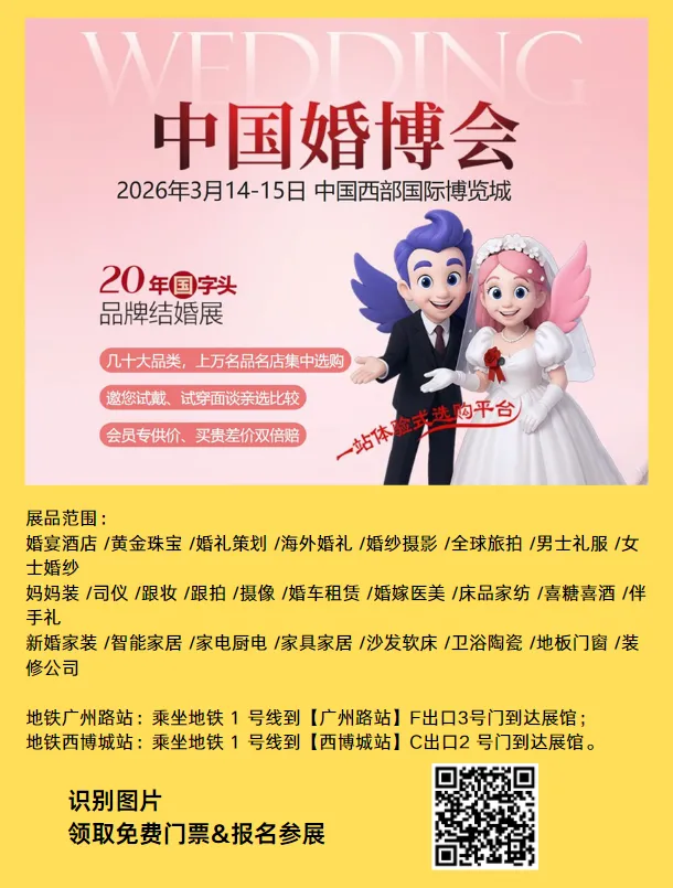 2026年成都婚博会将于3月14-15日在中国西部国际博览城开幕。拍婚照、订婚宴、找婚庆、买婚纱、选钻戒,还有喜酒喜糖、婚车、床品,20大结婚行业品牌参展,2天逛展一站购齐,省去东奔西跑,关键价格还优于门店,为您的婚礼精打细算!