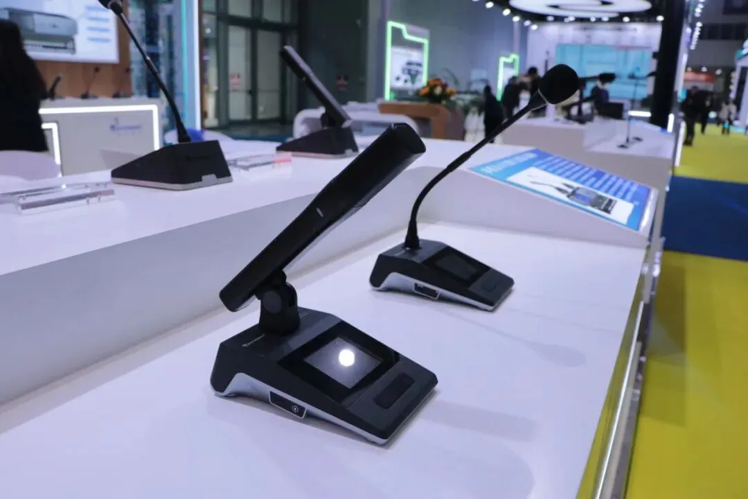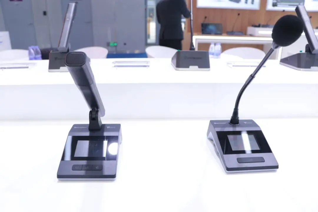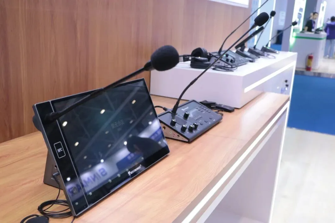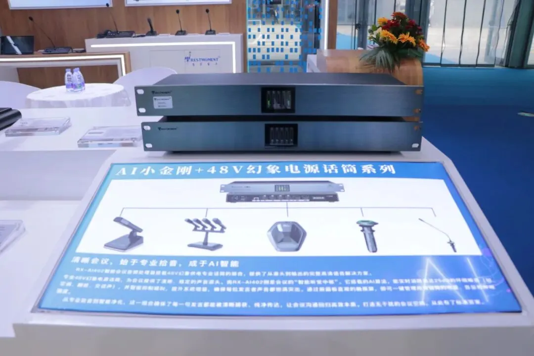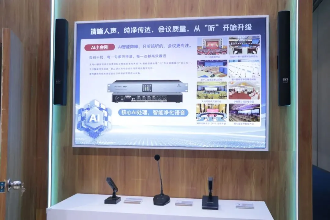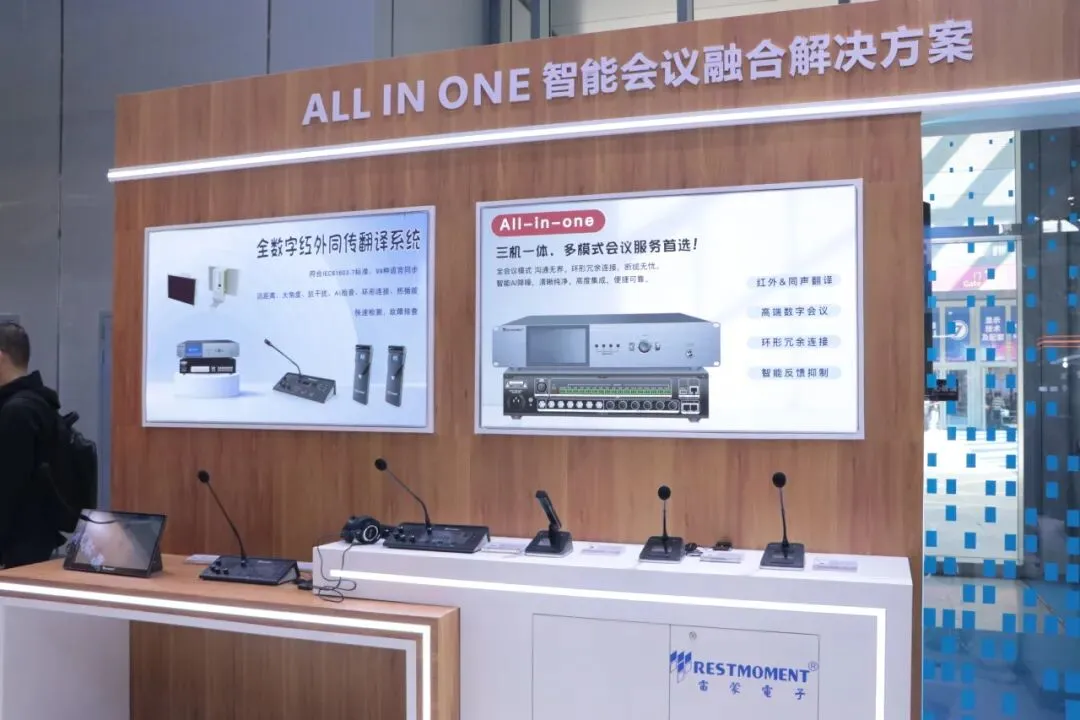 最新“和光”系列多模态AI智能会议系统,第四代全数字同声传译系统,U段无线音频解决方案,无纸化会议解决方案等多系列会议产品解决方案以及最新新品 三合一主机“ALL IN ONE”和“AI小金刚”处理器。