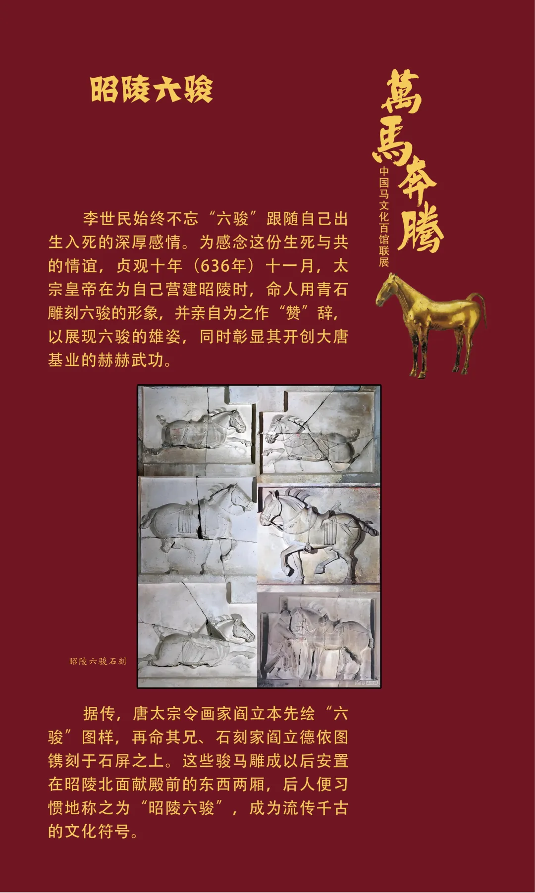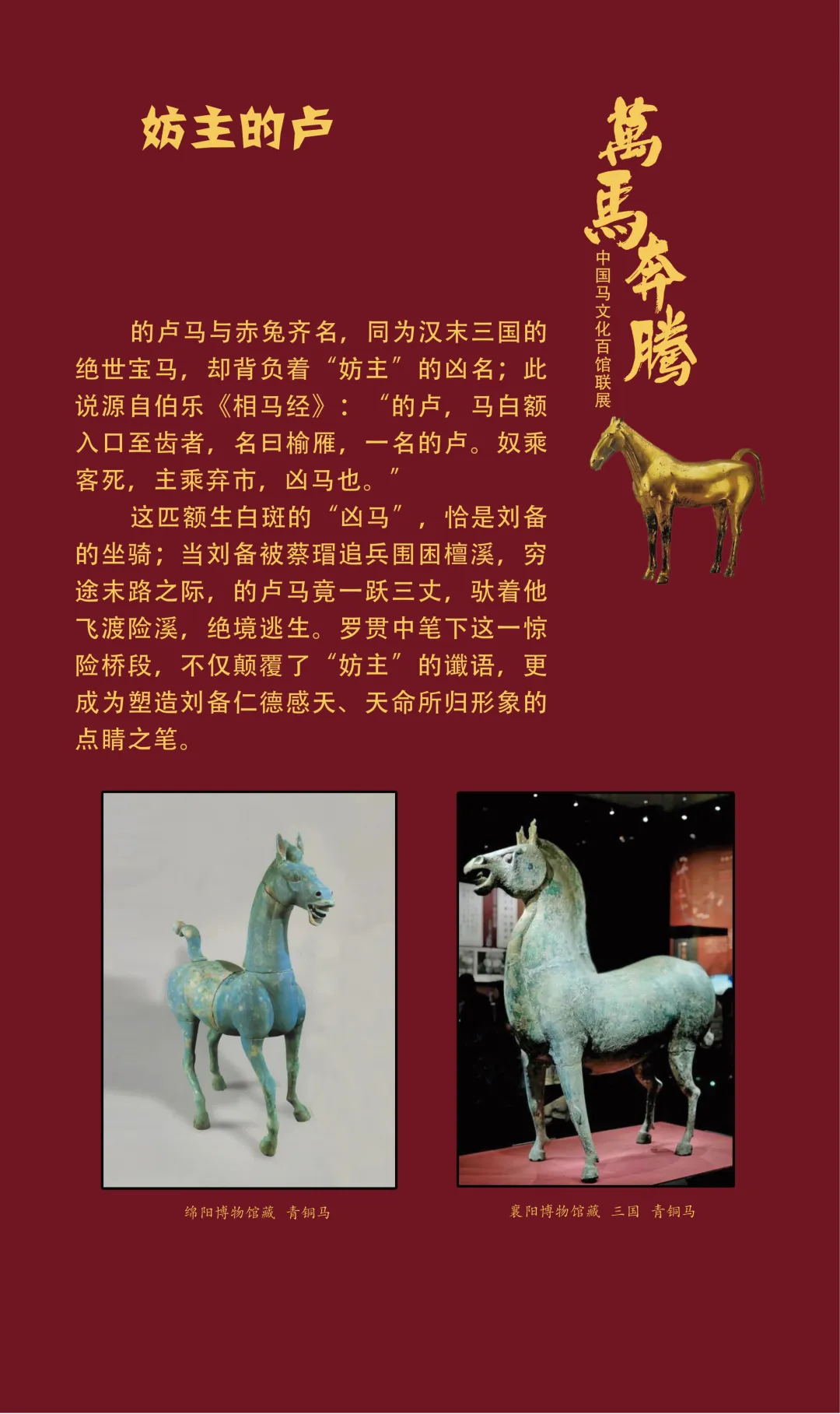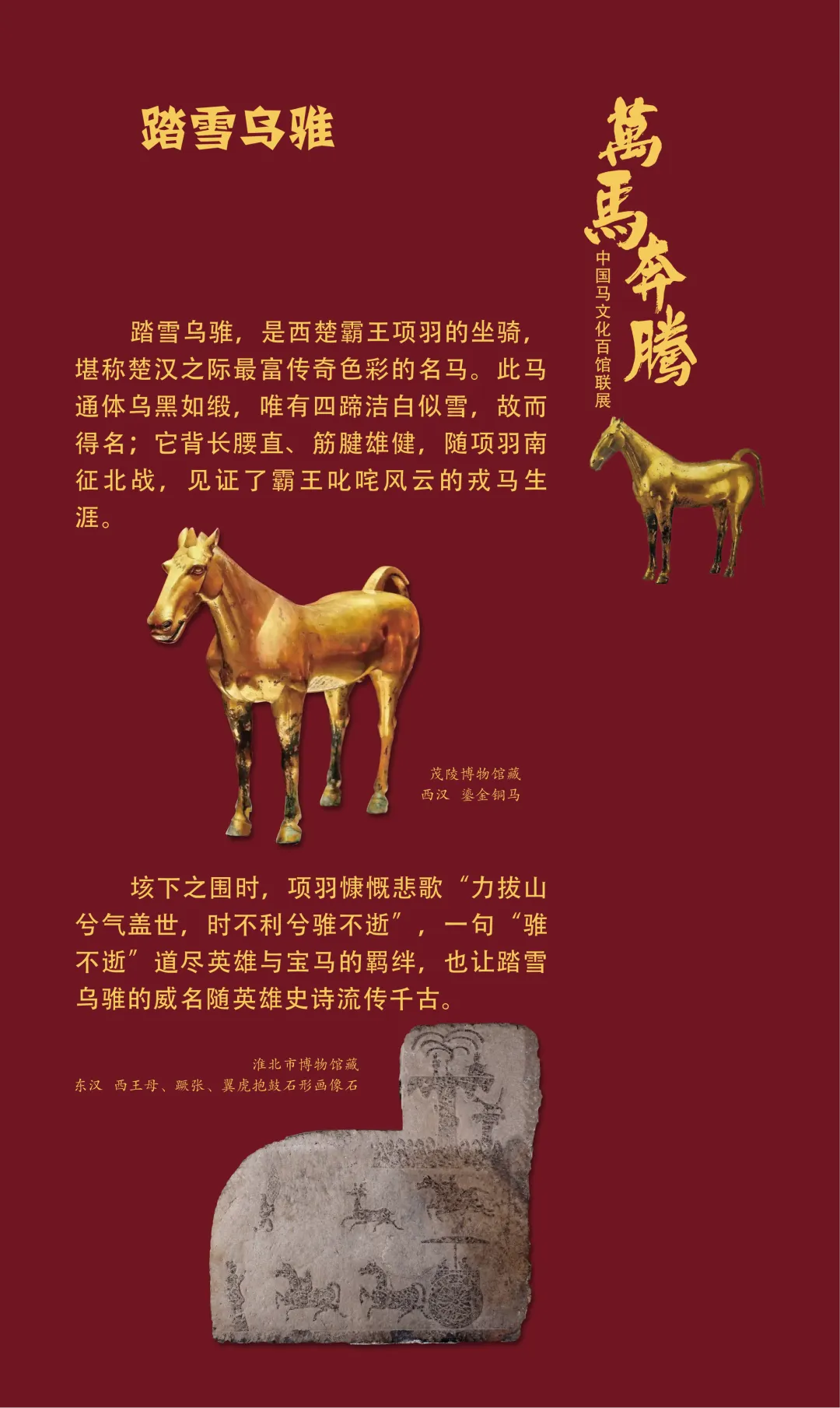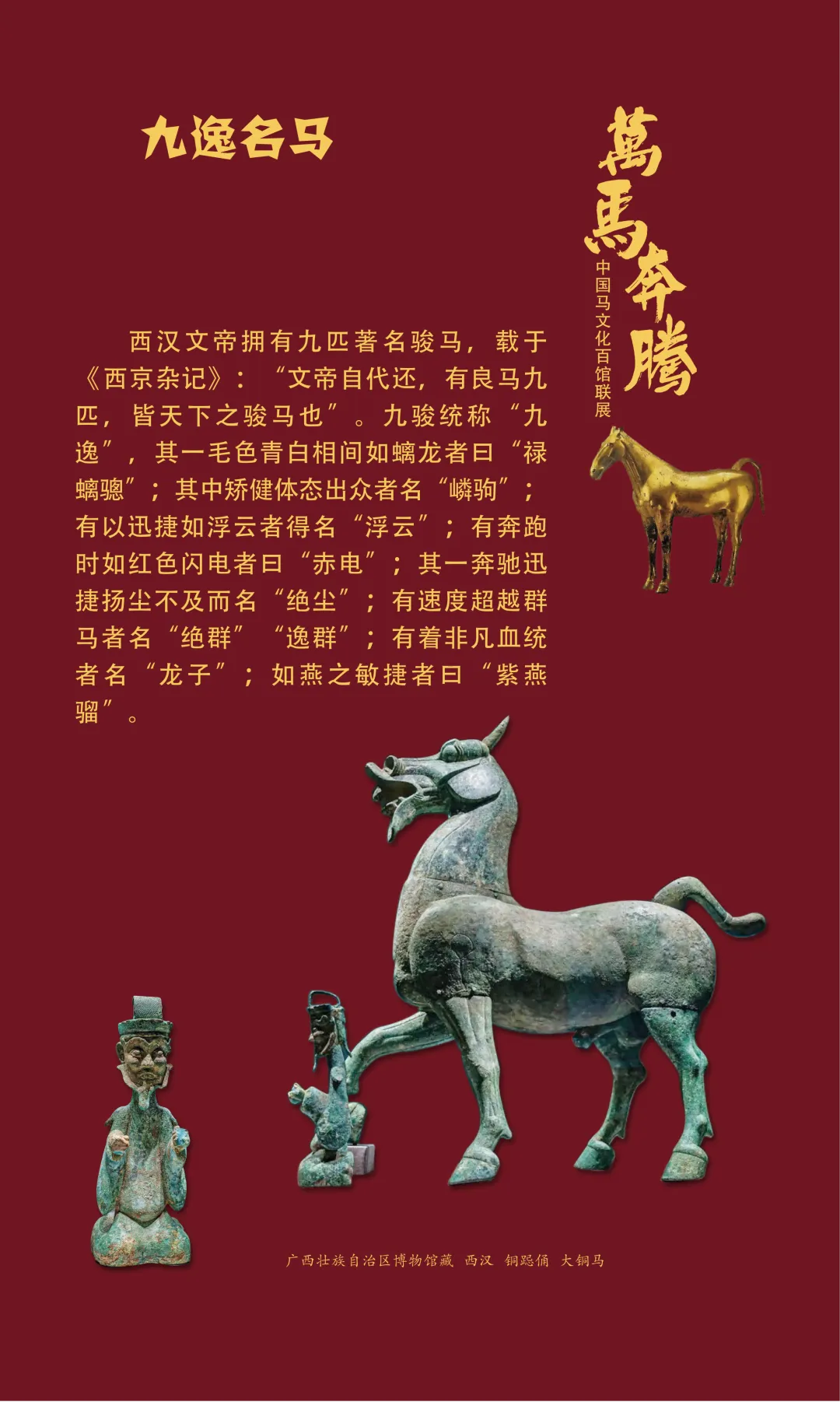 今天我们继续推出“万马奔腾——中国马文化百馆联展”线上展览(第三期)马之典故篇,以文物为媒,以典故为魂,从老马识途的指引归途,到穆马八骏的绝世风采,从踏雪乌骓的悲壮护主,到塞翁失马辩证祸福……一个个耳熟能详的典故,藏着古人处世的哲思。沙场之上,马革裹尸是将士的忠勇担当,昭陵六骏铭刻开国功勋;丝路途中,汗血天马踏沙而行,见证文明交融。这些典故跨越时空,化作青铜马的雄健、陶马的灵动、书画里的神采,在展品中鲜活再现。它们既是历史的印记,更是民族精神的传承,诠释着奋进、忠诚、智慧与担当。