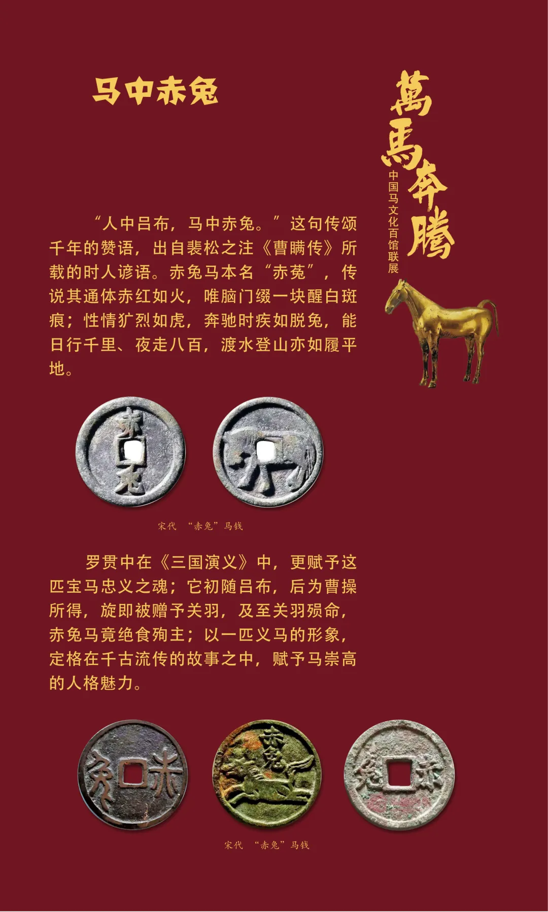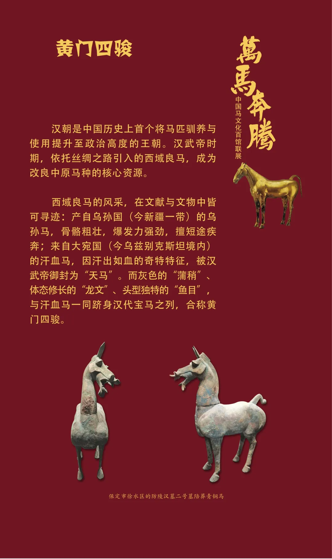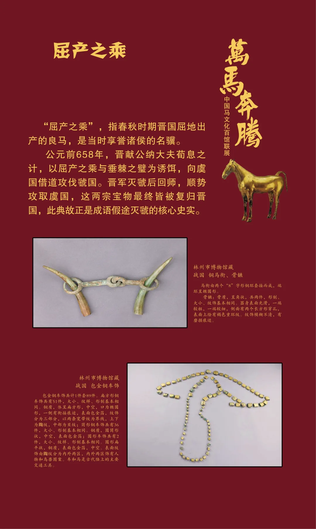 今天我们继续推出“万马奔腾——中国马文化百馆联展”线上展览(第三期)马之典故篇,以文物为媒,以典故为魂,从老马识途的指引归途,到穆马八骏的绝世风采,从踏雪乌骓的悲壮护主,到塞翁失马辩证祸福……一个个耳熟能详的典故,藏着古人处世的哲思。沙场之上,马革裹尸是将士的忠勇担当,昭陵六骏铭刻开国功勋;丝路途中,汗血天马踏沙而行,见证文明交融。这些典故跨越时空,化作青铜马的雄健、陶马的灵动、书画里的神采,在展品中鲜活再现。它们既是历史的印记,更是民族精神的传承,诠释着奋进、忠诚、智慧与担当。