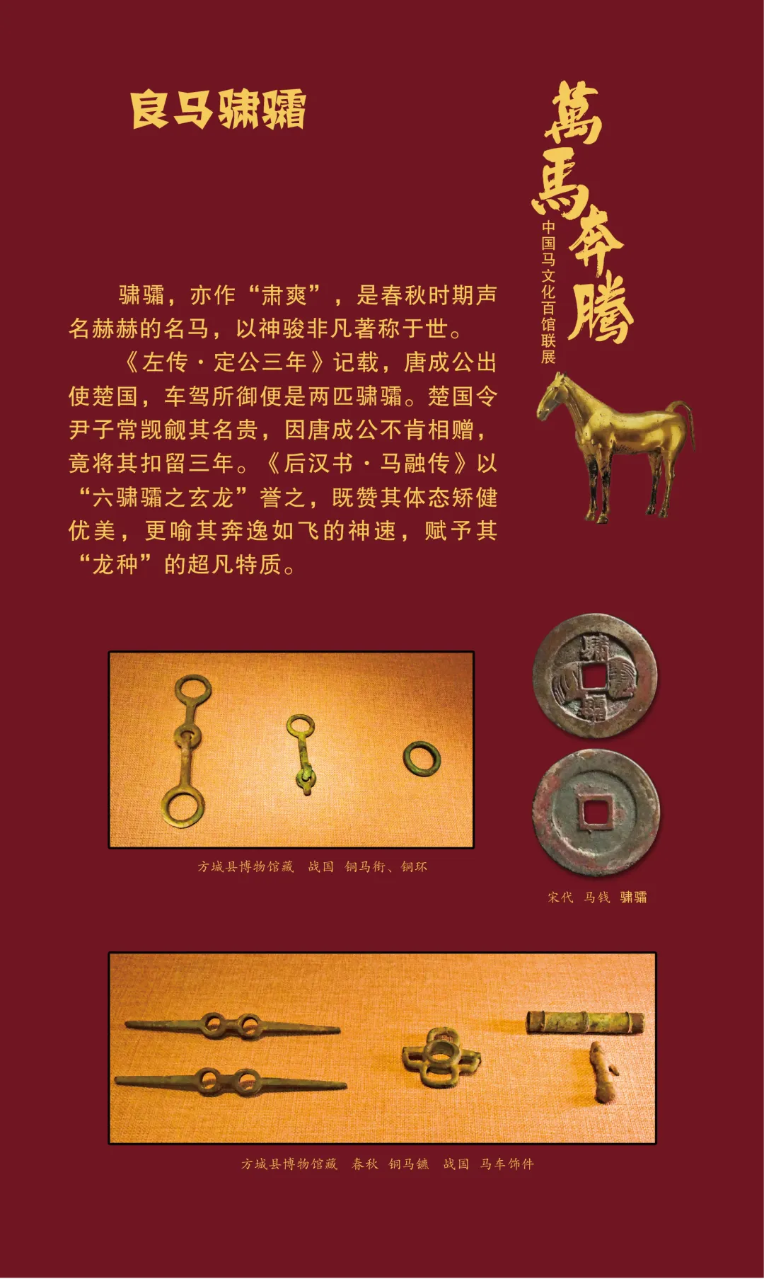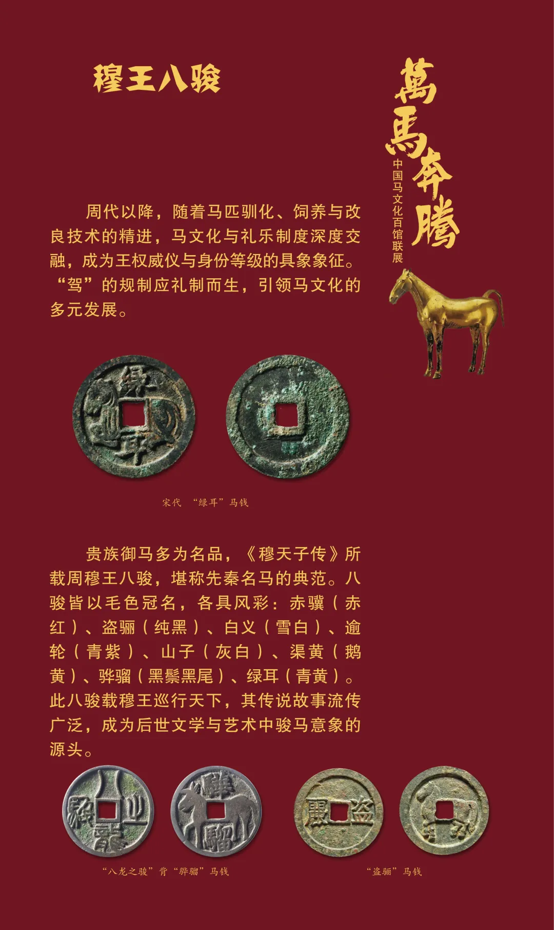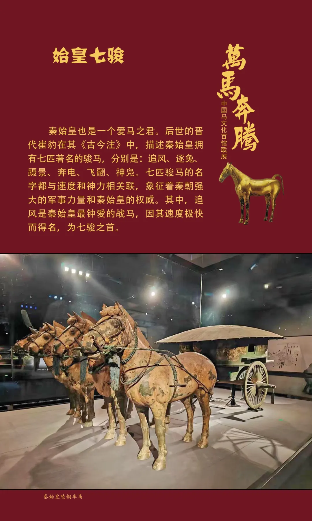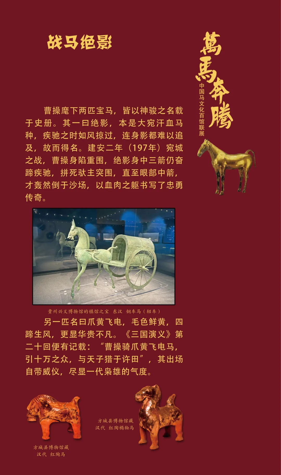 今天我们继续推出“万马奔腾——中国马文化百馆联展”线上展览(第三期)马之典故篇,以文物为媒,以典故为魂,从老马识途的指引归途,到穆马八骏的绝世风采,从踏雪乌骓的悲壮护主,到塞翁失马辩证祸福……一个个耳熟能详的典故,藏着古人处世的哲思。沙场之上,马革裹尸是将士的忠勇担当,昭陵六骏铭刻开国功勋;丝路途中,汗血天马踏沙而行,见证文明交融。这些典故跨越时空,化作青铜马的雄健、陶马的灵动、书画里的神采,在展品中鲜活再现。它们既是历史的印记,更是民族精神的传承,诠释着奋进、忠诚、智慧与担当。