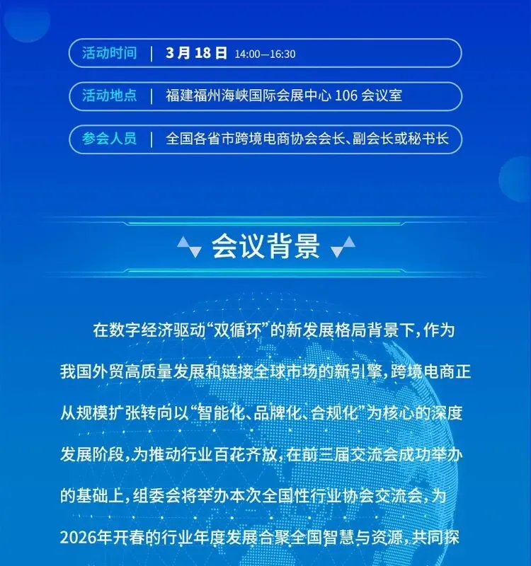 官宣定档!2026中国跨境电商交易会(简称:福州跨交会)将于3月18-20日在福州海峡国际会展中心举办!1-8号展馆及开幕大厅全开,展览总面积达到10万平方米,规模创历届之最。会参展生态将大幅扩容,多个创新专区首次亮相。