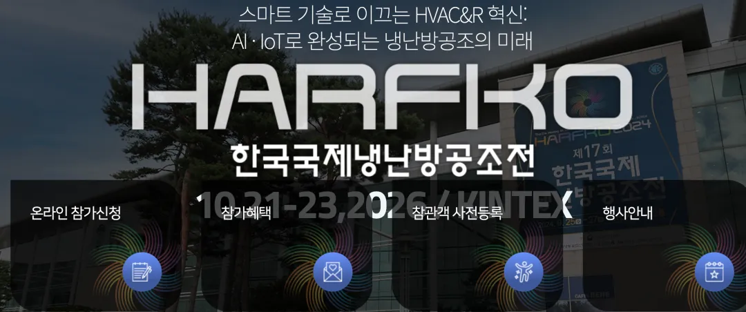 韩国国际空调制冷展(HARFKO)是由韩国产业通商资源部和韩国制冷空调工业协会主办,已有 37 年历史。展会两年一届,是韩国制冷空调全行业的盛会,相关会员企业及上下游关联企业齐聚,也吸引了来自全球知名企业的参与,多个国家制冷协会出席相关展会活动成为空调制冷行业国际技术交流、采购重要的交流平台。随着韩国展会报名的知名企业越来越多,吸引的专业买家也是逐年增加。2026 年展会的口号是”智能技术引领的暖通空调创新:AI·物联网完成供暖和制冷的未来。通过新技术和创新解决方案,我们旨在向参观者传达供暖和制冷行业的未来形象。