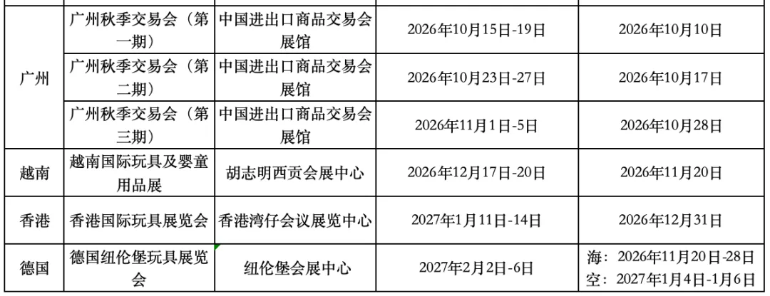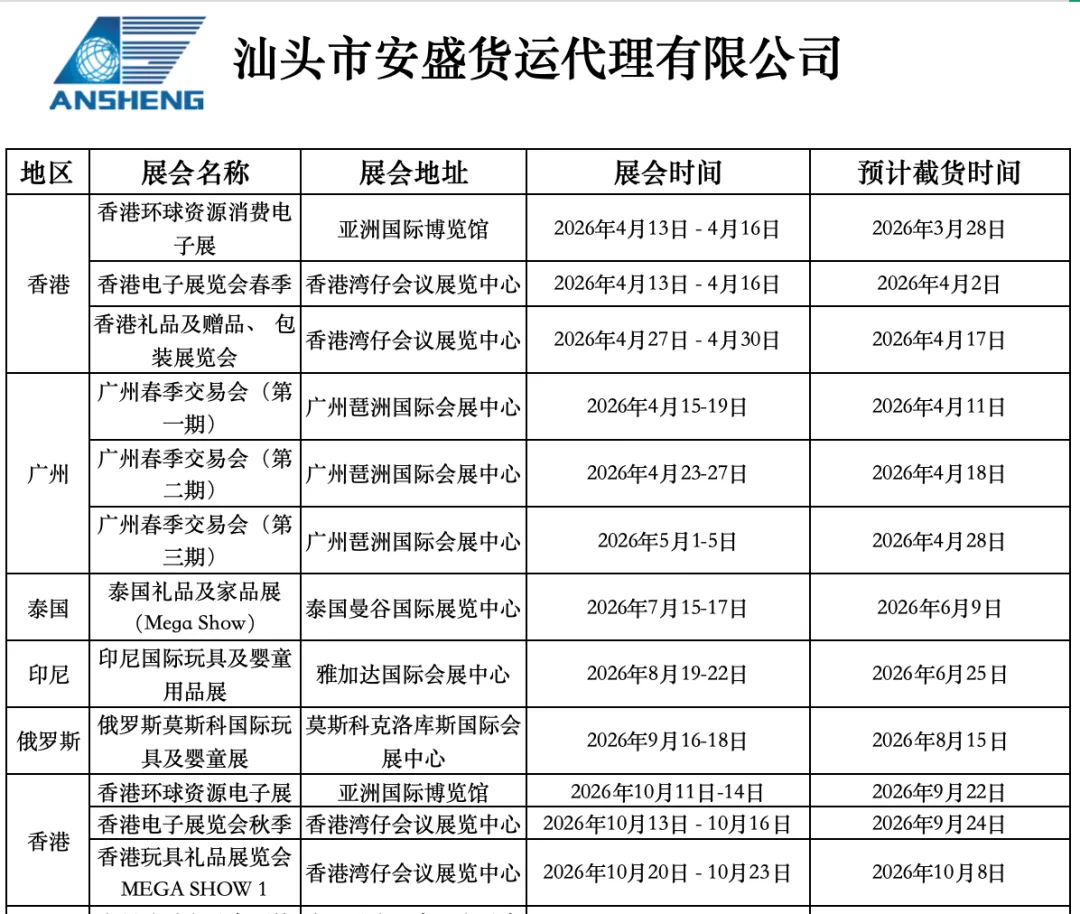 此份“展会一览表”,根据展会举办的时间顺序进行排列,整理了我司2026年4月份-2027年2月份有承运的展会,欢迎有需要的客户联系我们。