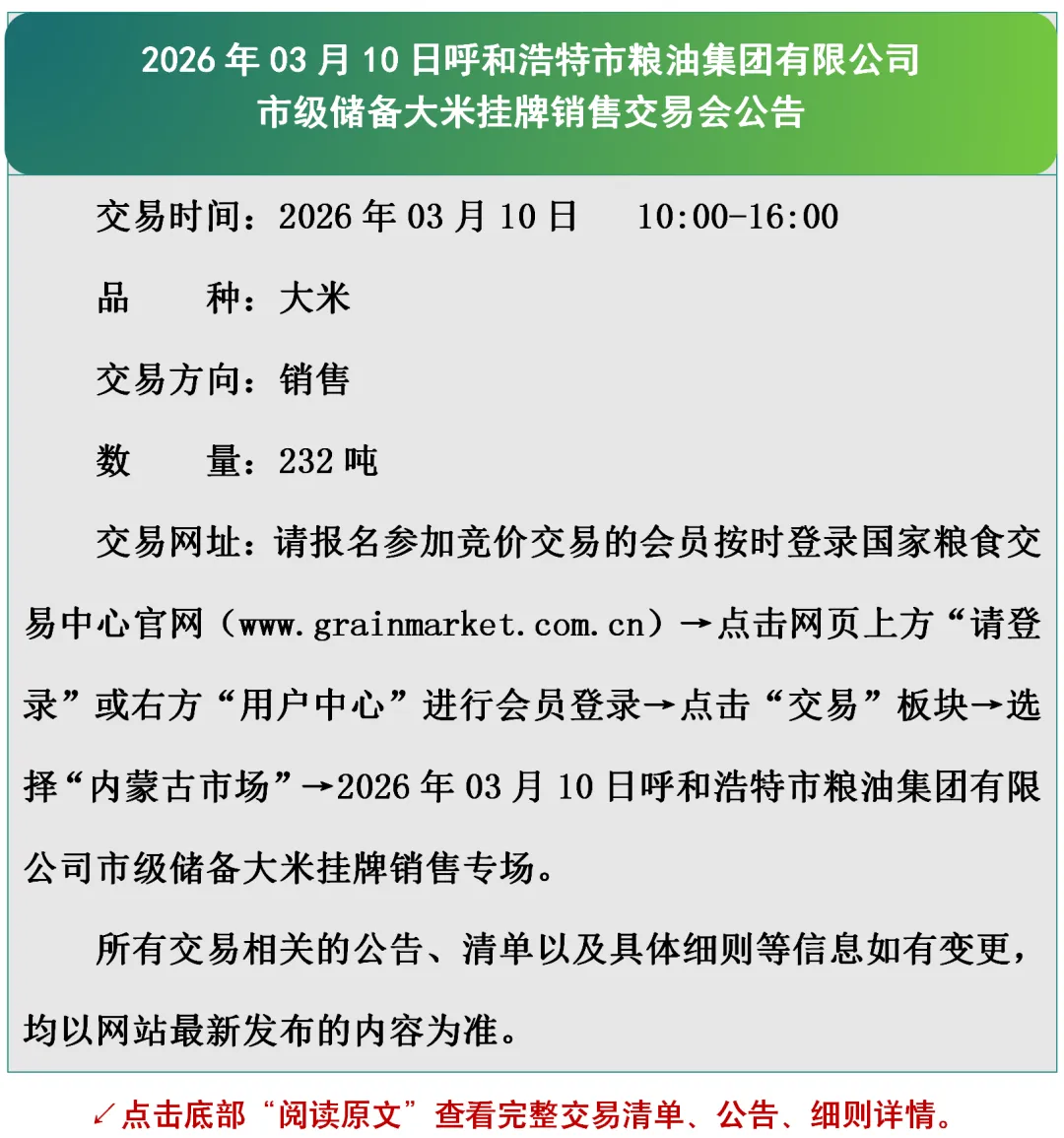 2026年03月10日呼和浩特市粮油集团有限公司市级储备大米挂牌销售交易会公告