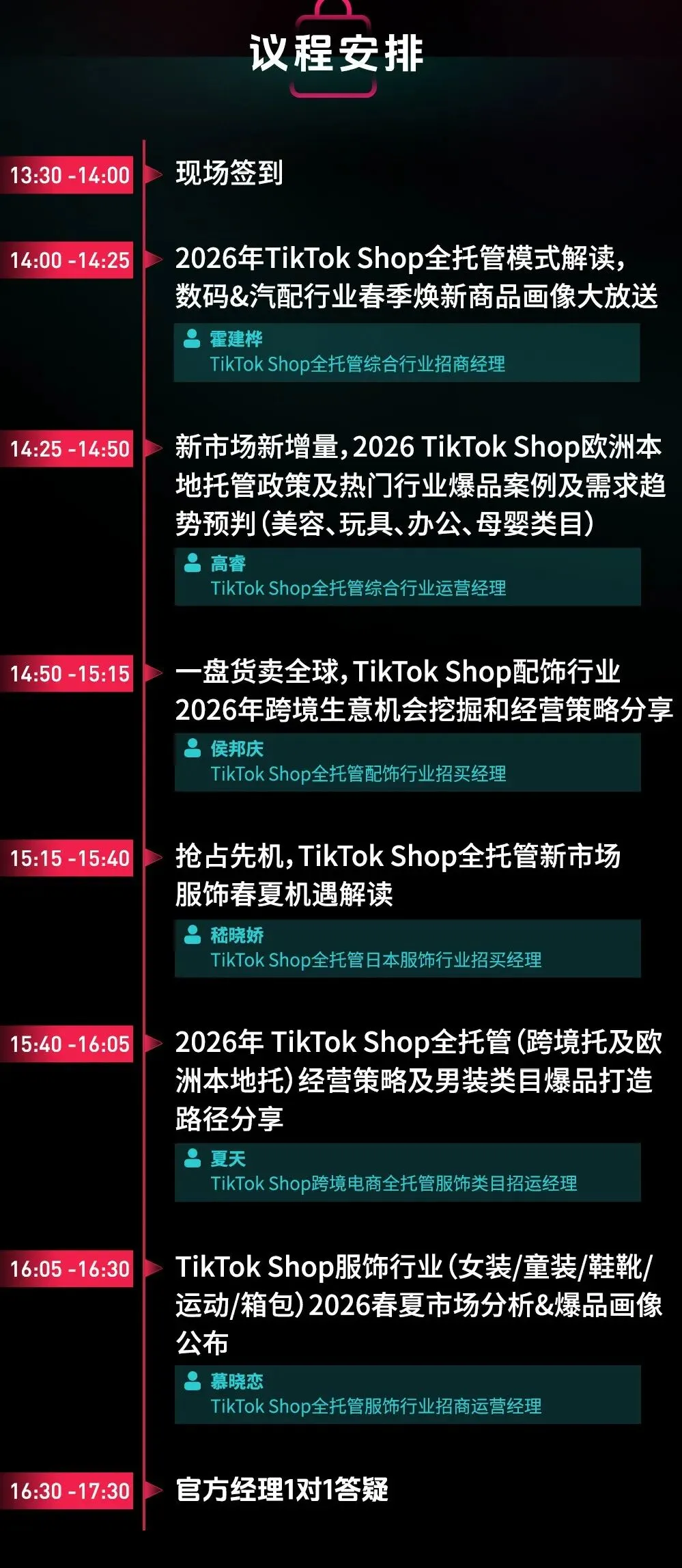 截止目前,TikTok Shop全托管已面向美国、英国、欧盟四国(德法西意)、墨西哥等市场开放,更多潜力市场即将上线。如果您想知道目前全托管全球市场爆品方向,点击免费查看·3月12日·深圳·TikTok Shop全托管春夏全品类招商会↓