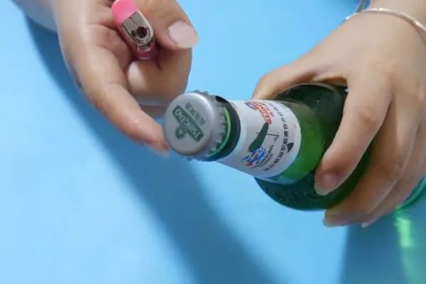 首先准备好一瓶啤酒和一个打火机,用打火机对着啤酒瓶盖的边缘,点火均匀烤两分钟左右,要不停的转动啤酒让它受热均匀。