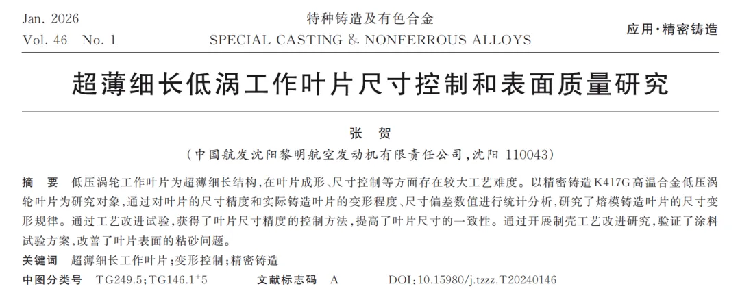 航空发动机低压涡轮工作叶片作为发动机核心关键部件,其制造质量直接决定发动机整体性能。该类叶片属于薄壁细长结构,在结构形式、外形尺寸等方面与常规叶片差异显著,尺寸精度要求极高。在精密铸造生产过程中,需多次进行尺寸校正与抛修,严重制约生产效率;同时,叶片在应力作用下易产生微裂纹,进而导致产品报废。