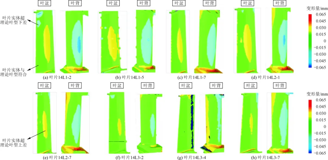 开展第一次技术改进,选取原技术方案生产的8件不同模组叶片作为试验样本。在叶片校正前,采用绝对关节臂光学测量系统对叶片进行全尺寸扫描,通过系统自动拟合叶片实体模型与标准三维模型,完成偏差比对,比对结果如图2所示。通过该比对可获取叶片主要理论截面上X、Y方向的最大偏差值及Z向扭角,进而明确叶片实体与理论叶型的尺寸扭转方向及具体偏差数值。