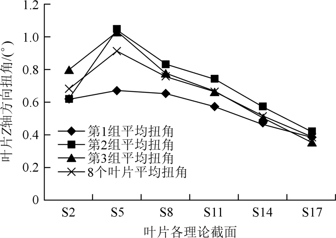 由图2可知,叶片叶身抛修量存在不足,尤其近排气边R部位表现更为明显,经整体抛修后,叶片弦宽尺寸基本接近设计公差下限。基于上述测量数据,进一步计算得出同一模组叶片在Z轴方向的平均扭角,以及8件叶片的整体平均扭角,计算结果如图3所示。结合图2与图3的分析结果,可总结叶片主要变形特征如下:叶盆中下部在Y轴方向向叶背侧弯曲,平均变形量约0.1mm;叶冠向排气边方向、朝叶盆侧扭转,平均扭角约0.7°;叶冠及缘板在Z轴方向分别呈现向下、向上的变形趋势,导致叶片通道长度偏短,平均变形量约0.2mm。