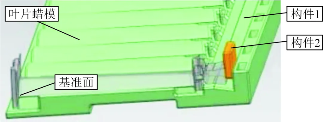 蜡模校正胎具结构见图 5。蜡模在胎具上以叶冠内表面为基准贴合面,可有效控制叶冠扭转变形;蜡模上表面放置砂袋,确保叶片蜡模叶盆型面与胎具型面完全贴合,稳定保证叶身型面形状与尺寸;沿叶片 Z 轴方向设置检测量块,用于控制蜡模状态下的通道长度,从而保障铸件通道长度尺寸合格。