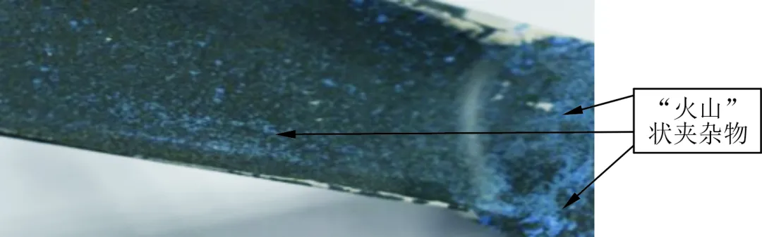 试制初期,叶片表面存在严重的粘砂问题,见图6,在进行荧光检查时可以发现叶片的缘板、叶身、叶冠等区域均有不同程度的夹渣等荧光显示,见图7。浇注后的金属件表面均进行抛修才能满足表面粗糙度要求,导致铸件需要整体抛修后才能符合表面质量要求,造成冗余反复工序,而且打磨过程中容易造成表面磨伤和尺寸抛修过量等问题。
