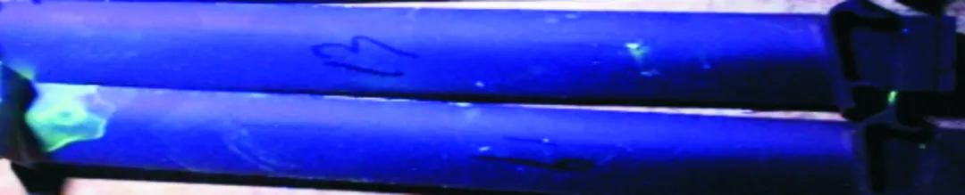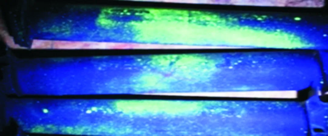 型壳表面层铝酸钴的加入量从50%→40%→30%→15%,进行了3个含量的调整试验,其他成分不变,最后试验发现铝酸钴的加入量在15%时,可以有效控制粘砂及荧光显示缺陷,同时保证叶片的晶粒度合格,改善后的效果见图8和图9。