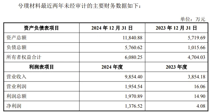 兮璞材料2023年、2024年营业收入分别为3854万元、9854万元,净利润分别为4.08万元、1377万元。