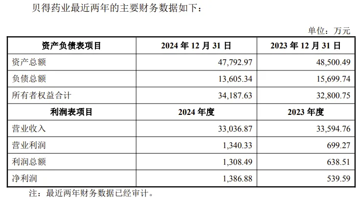 贝得药业主营业务主要为抗感染类、心血管类、消化系统类等药物的研发、制造和销售。2023年、2024年公司实现营业收入分别为33595万元、33037万元,净利润分别为540万元、1387万元。