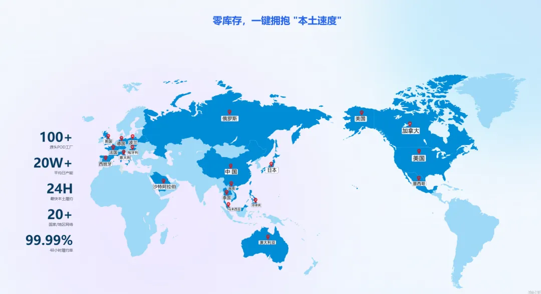 整合全球20+国家/地区、200+本土POD智能工厂,覆盖美区、欧洲、巴西、东南亚等核心市场,涵盖服装服饰、家居家纺、3C数码等全品类;