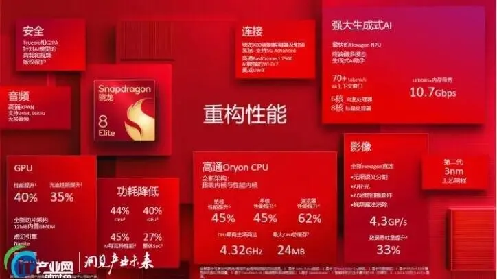 在CPU方面,骁龙8至尊版采用高通自研的第二代Oryon架构CPU,包含两个超级内核与六个性能内核,主频达4.32GHz。图形处理方面,骁龙8至尊版集成了Adreno GPU,为多模态AI场景中涉及视觉处理与图像推理的任务提供了充沛的算力支持。而骁龙8至尊版集成的增强型Hexagon NPU,配备6核向量处理器和8核标量处理器,AI每瓦特性能较前代提升45%。在部分主流大语言模型上,处理速度可达70 tokens/s以上。多模态模型支持的引入显著提升了骁龙8至尊版NPU对AI指令的处理效率。以语音交互为例,有了LMM(大型多模态模型)的加持,NPU可以直接对语音内容进行识别和理解,手机的响应速度也得到了明显的改善。在图像理解方面,LMM同样发挥着关键作用——NPU无需借助额外模块便可直接解析图片内容,既能提升图片文字翻译的处理速度,也让NPU对图像语义的整体理解能力得到进一步增强。