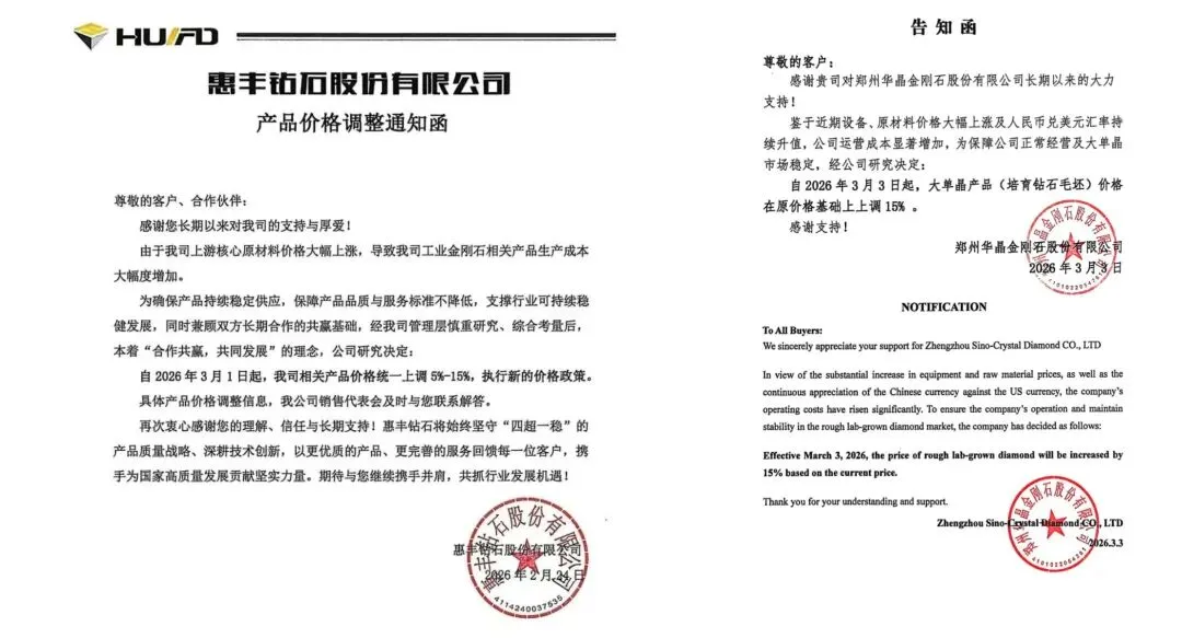 从2月开始,郑州华晶、惠丰钻石等领军企业接连发出调价函。最引人注目的是3月3日,郑州华晶那张加盖红公章的双语告知函——毛坯价格直接上调15%。