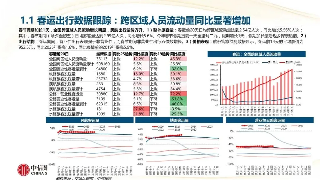 其中,春节期间(除夕至初五)日均旅客量达到2.99亿人次,同比增长5.6%。今年春节假期提前一天至脂月二九,假期加长1天,假期加长激活返乡探亲热情,22)出行结构:春运期间,营业性出行表现强于非营业性,而春节期间非营业性出行双位数增长。3)价格表现:航班管家监测数据显示,春运前14天的平均票价为9952.5元,同比2025年提高1.6%,同比疫情前的2019年提高5.9%