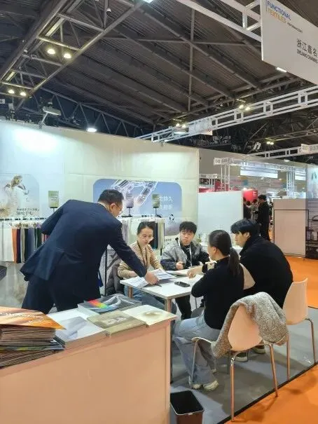 团队主动出击拓展市场资源,面对2026上海国际功能性纺织品展汇聚的行业精英,积极与功能性面料企业、品牌采购商展开交流,精准捕捉“科技、可持续、功能性”的最新趋势,并向潜在合作伙伴详细介绍了东方纺织城项目的全产业链生态与平台优势。