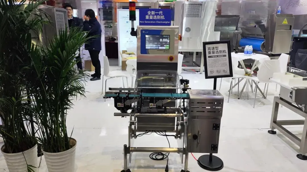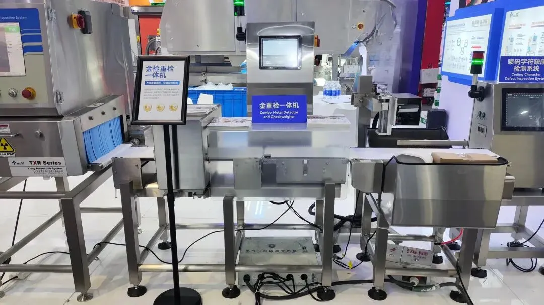 重量合规检测板块,太易展位中的高速型重量选别机、金重检一体机分别适用于高速高精度动态称重,以及金属检测、重量选别一体化需求,广泛应用于袋装、盒装、桶装等产品。