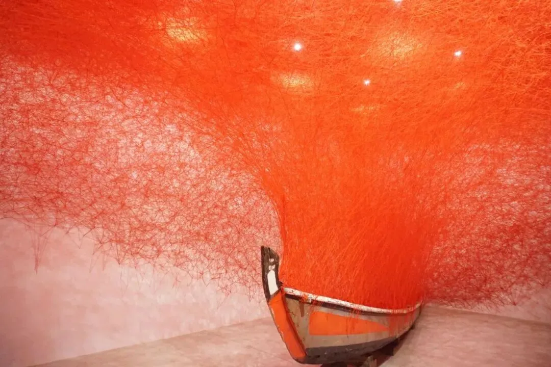 再往前就是第二展厅(Memory of Water),这个展厅挂了帘子,从走廊看过去隐隐透露红色,一进去哇视觉冲击力很强,是由不断纠缠的红绳(比红线稍微粗一点)从船里涌动出来往外铺开链接到墙上,并且有弧度,像一张落下的网罩住上部空间。