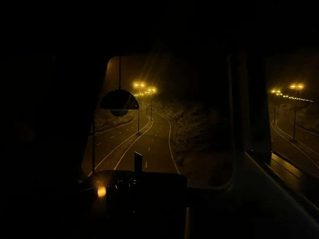 怀着有点失望的情绪,走入了第二展厅对门的第三展厅(Location),哇塞这个展厅真是太妙了!我私心觉得前面那个可能就是用来欲扬先抑的。这个展厅走进去是伸手不见五指的黑,完全是一点点挪着摸着往前走,然后隐隐感到里面有点音乐声和非常微弱的光线,往右一看,居然是面对面的沙发卡座,卡座旁是一面“落地窗”窗外是延伸到远处黑暗里的高速公路和透下暖光的点点路灯。
