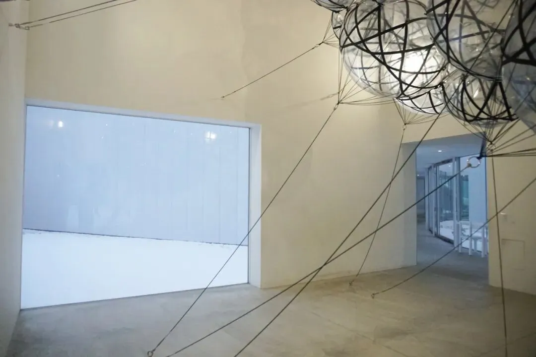 我当时对LJY说,感觉整个空间像宇宙 那头羊像是看见超新星爆炸吓得跌倒。后来看导览册说“伴随着背景里的电子噪声,显示器上呈现红色、蓝色和绿色光线。在球形镜的随机反光中,一只毛茸茸的神秘白色生物躺在地上,凝视着我们看不见的事物。这件作品的部分灵感来自《2001:太空漫游》等经典科幻电影,借此带领我们远离此时此地,迷失在时空之中,而过去曾经描绘的未来,便冻结于此。” 感觉自己猜得大差不差!