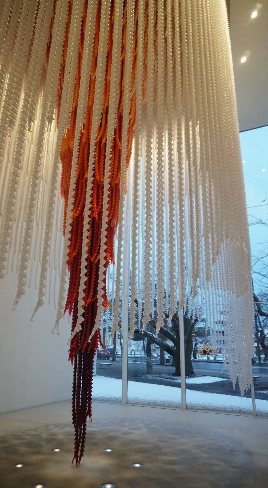 尤其是一些小型装置雕塑设立在内庭,能让人从走廊里走到室外去看去摸(不过那时天气太冷,官方锁门不允许出门活动),那些内庭装置雕塑又与外部城市街道只隔了一条玻璃走廊,欸就会有是不是外面行人也能进来的错觉。