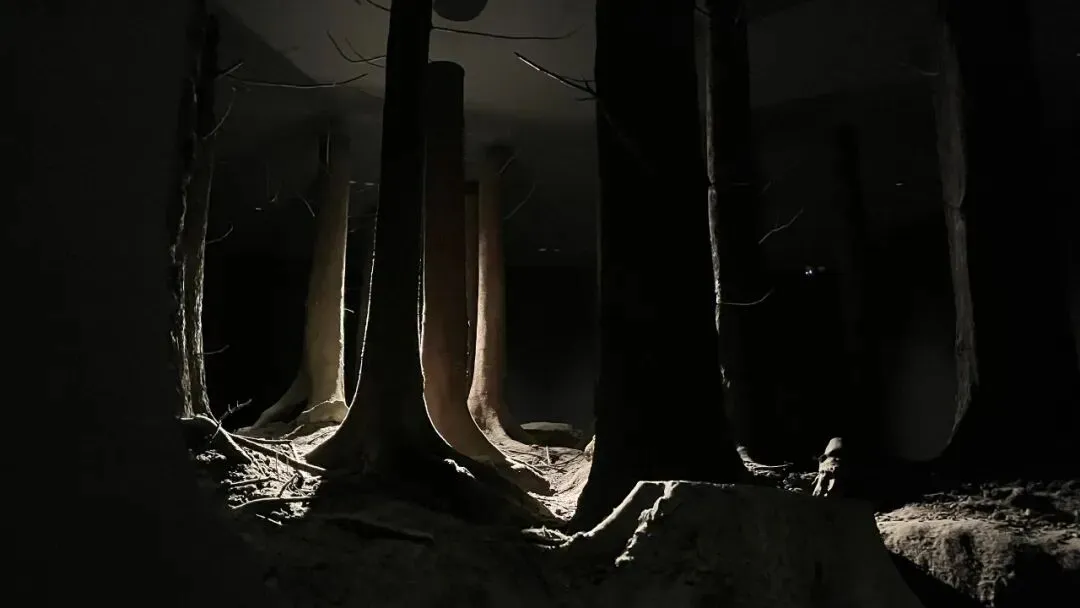走到二楼会有一个平台空间可短暂停留一下,然后就要掀开厚厚帘子走入第九展厅(This Thing Called Darkness), 这个展厅只有一束光源,四周墙壁为黑色,中间是个长方形底座有半人高的地形模型,模拟了一块有许多树木的林间地形,唯一的那束光源像是日间第一束阳光带着点暖意投入森林,虽然整个展厅是黑的,但并不会让人觉得很惊恐,反而有一丝柔和。