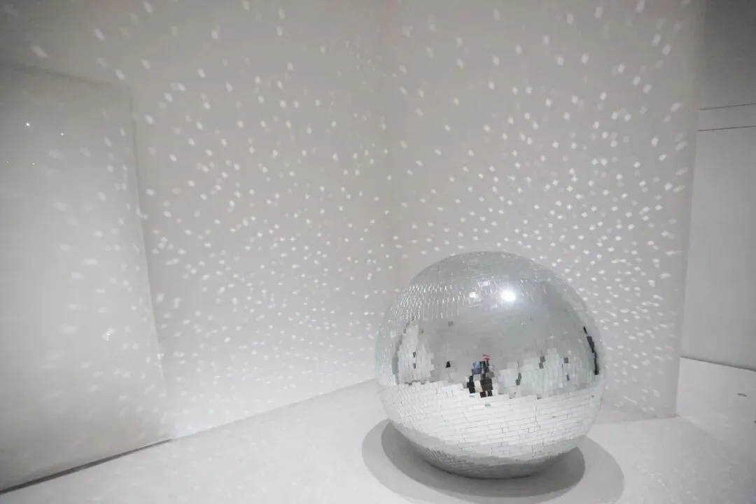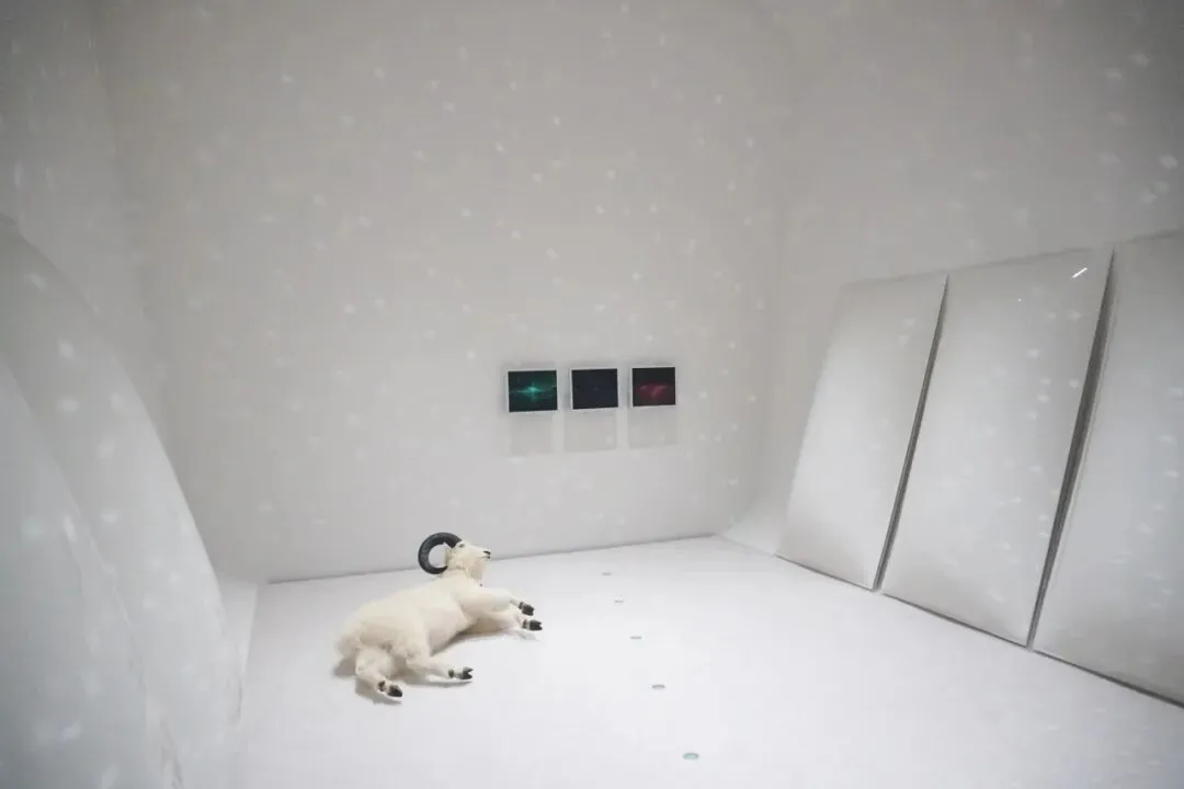 唰 门打开,和前一个展厅完全不同 这是个完全纯白的世界,地面也是白色毛绒绒地毯,展厅里放着嘈杂的轻噪音有点类似接收信号的老式收音机,空间内的灯光很亮,在中间有一个匍匐半躺倒的生物像是头羊,它睁大眼睛有点惊恐的看斜上方,在它的斜对角放了个银色的迪斯科球正在把点点光斑投射到整个空间里。说实话,虽然白色是很纯洁的颜色,但这个空间整体却会让人感到一丝不舒服,就有点像电影里那种明晃晃的警局审讯室 整个人暴露在过曝的白色中。