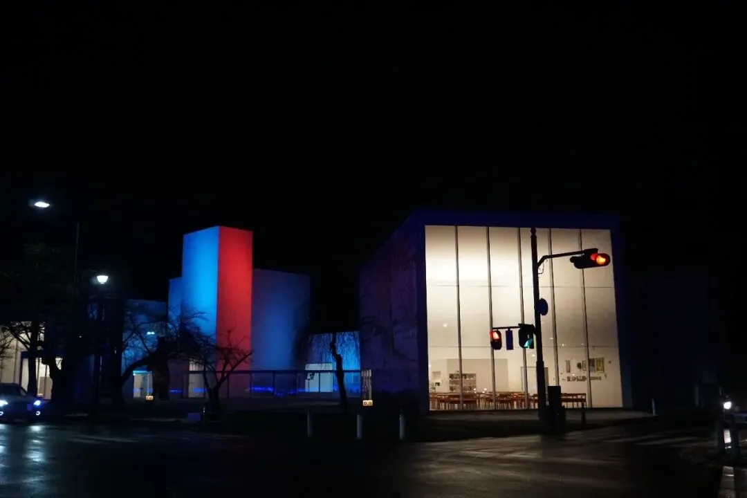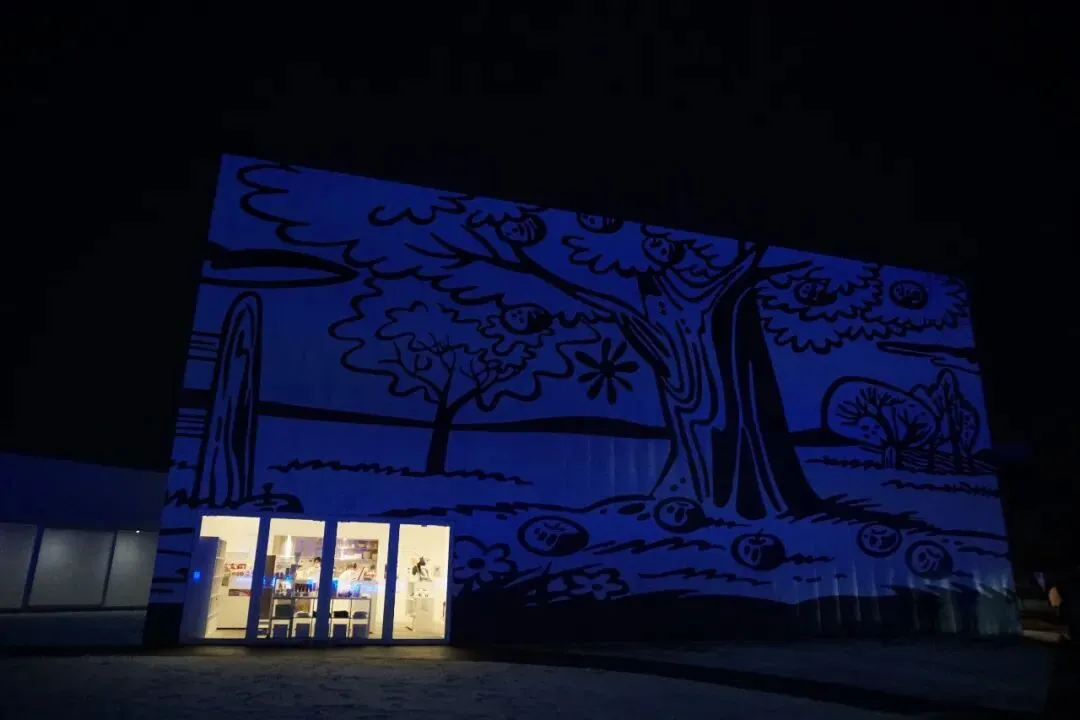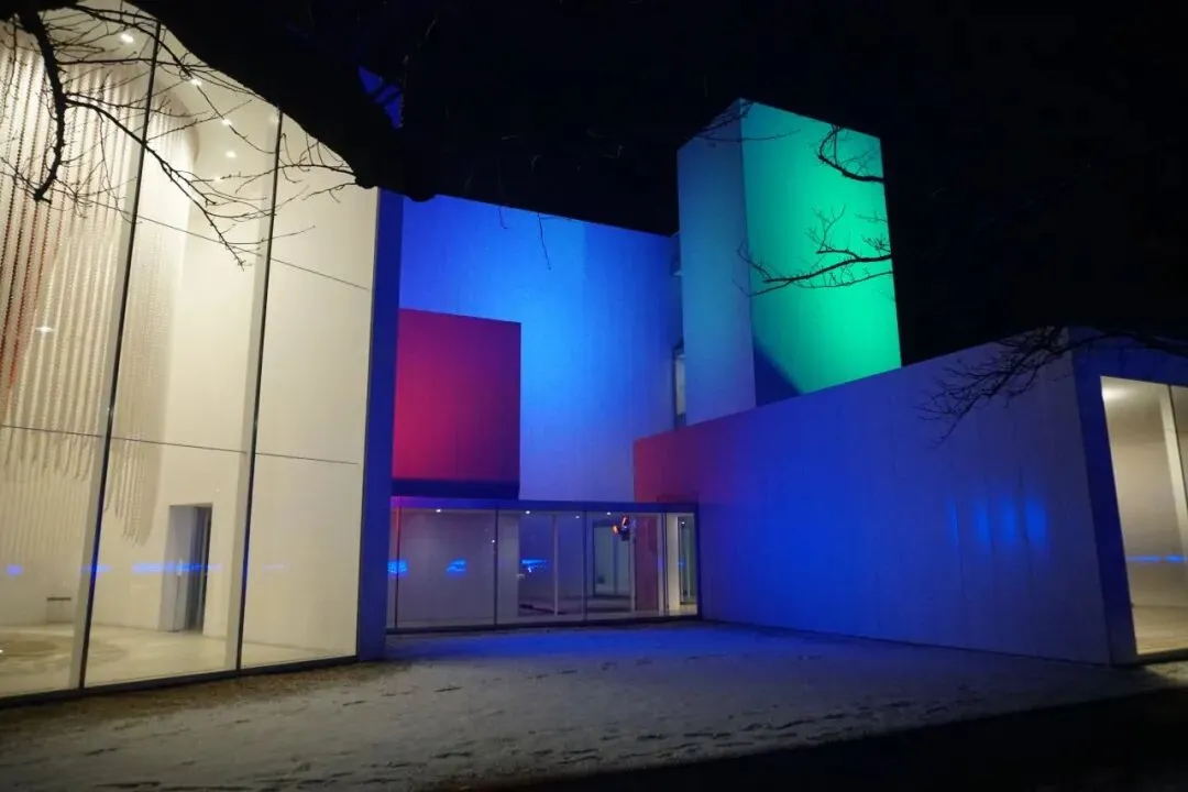 结果一出门,发现建筑亮灯了!而且这个灯光颜色很妙,高饱和又不断变化色彩,配合十和田现代美术馆建筑“方盒子”造型,像是几何画一般好看。最后发现自己真的很有天赋,因为回程路上看导览册上说这个灯光也是一个作品,得瑟一下哈。