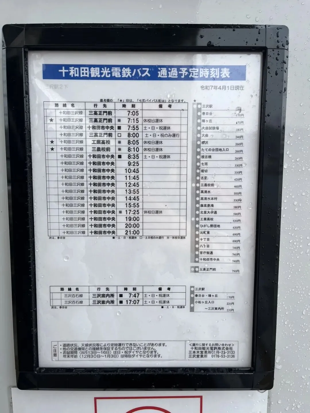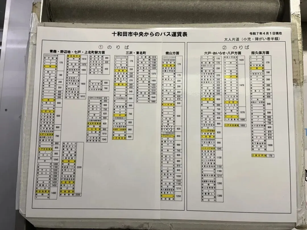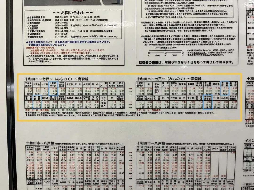 方法二(我更推荐 也是我自己乘坐的方法):导航到“十和田市中央”车站(注意是我图片的这个方向站台),这里有观光巴士可以直达青森市的青森站且总路程压缩到个半小时左右。请注意看图片里的班次时间,平日里运行6:24,9:54和17:54三班(周六、周日和节假日6:24那班停运),可以用西瓜卡刷卡上车。