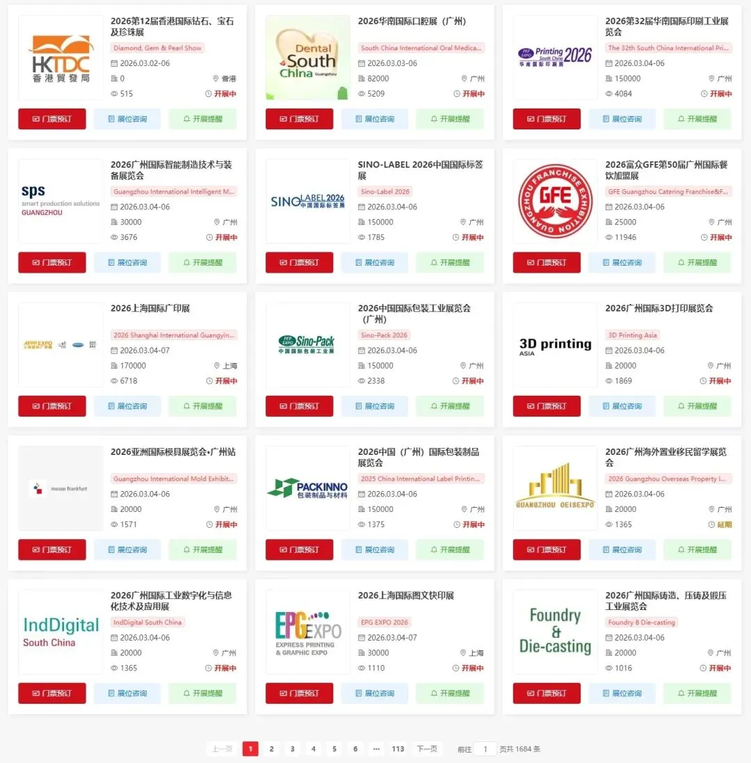 关注【展会一网通】微信公众号,在聊天对话框内点击底部菜单栏【全国展会】查看全国最新展会信息、门票预约入口