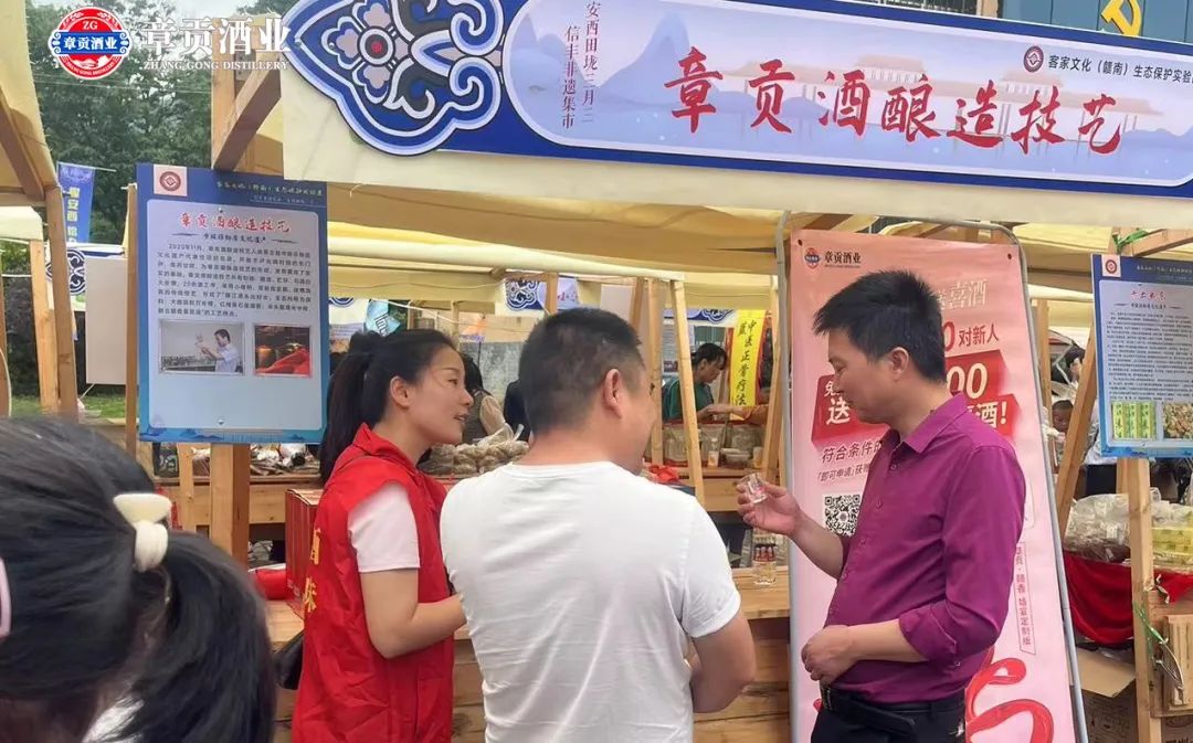 传承非遗技艺,弘扬传统文化。2023年4月22日,2023年安西镇田垅“三月三”乌饭节在信丰县隆重举行。章贡酒酿造技艺作为赣州非遗典型代表、赣州食品行业标杆企业惊艳亮相,吸引众多客商驻足关注。一口三香 “浓头酱尾米中间”的白酒口感深受消费者喜爱。章贡酒酿造技艺作为客家酒文化的传承者和传播者,必将以传播客家文化为己任,将客家赣派白酒酿造技艺不断发扬光大,助力赣南客家文化走向全球。
