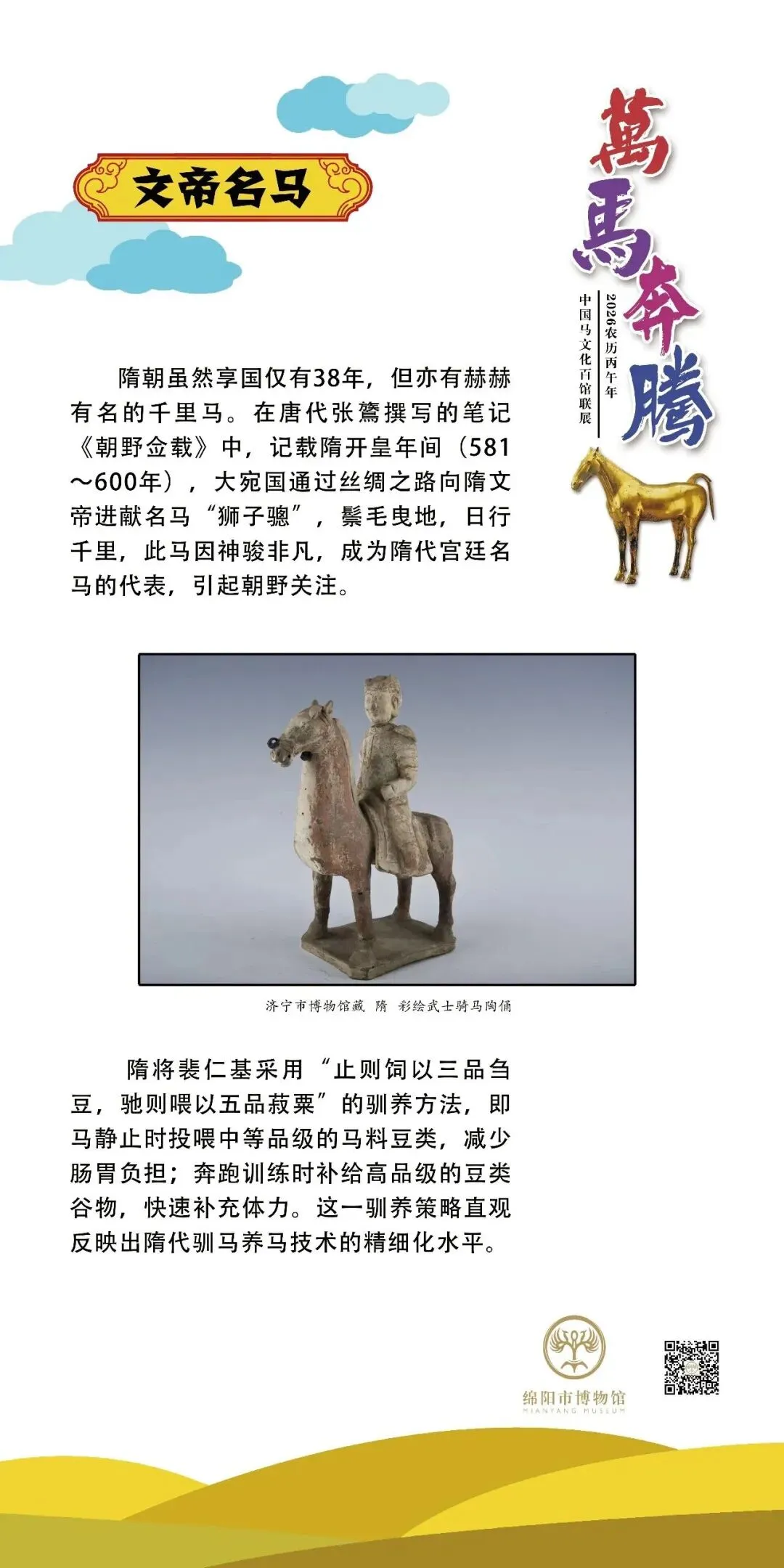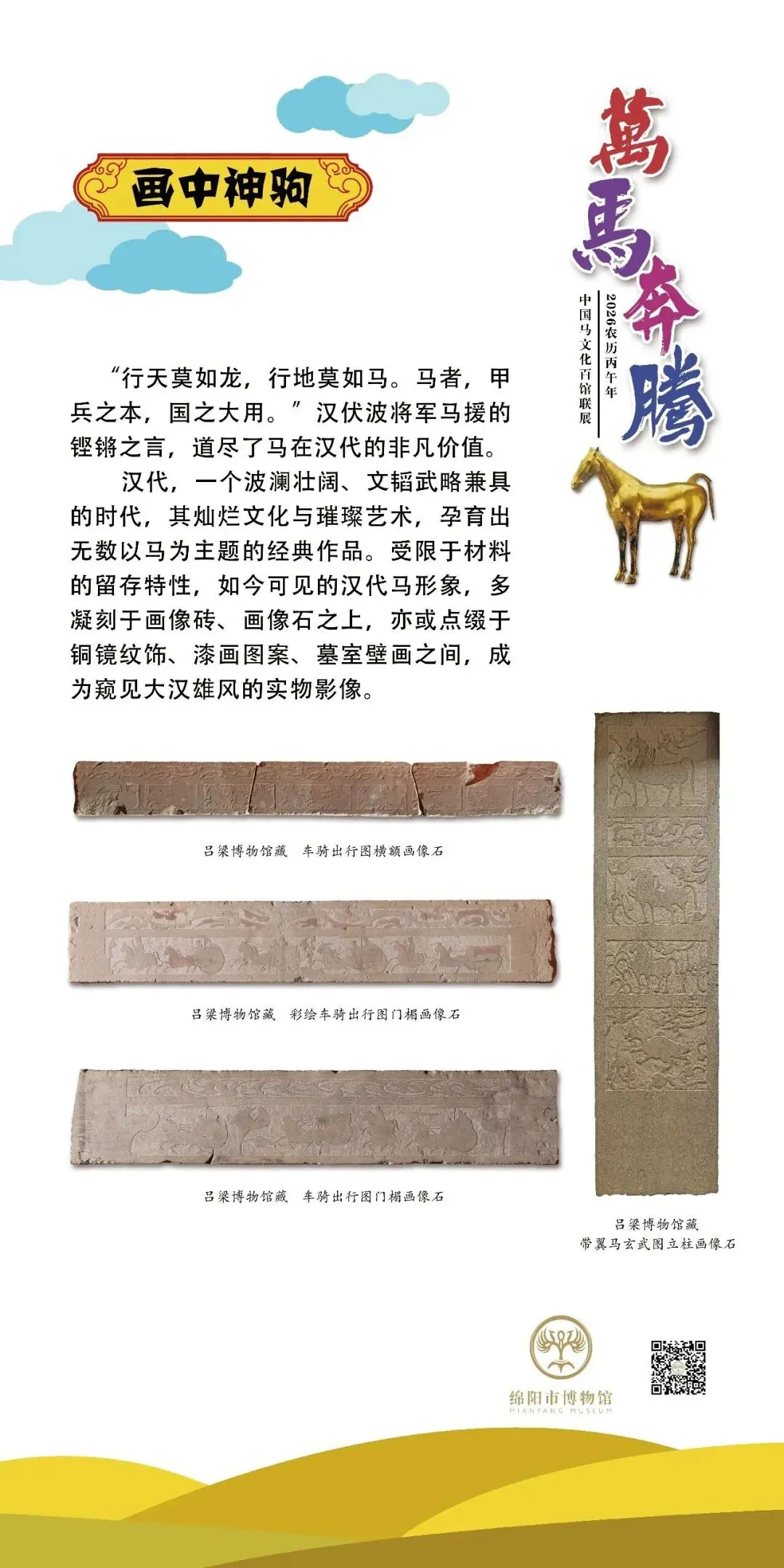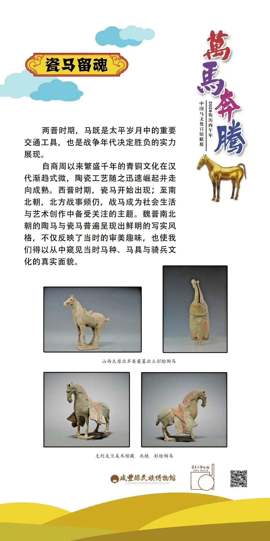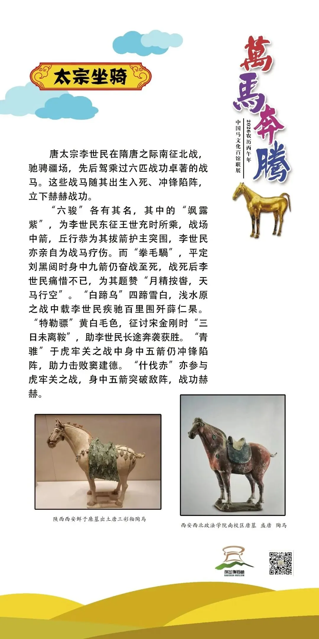 《万马奔腾——中国马文化百馆联展》是普洱市博为广大观众送上的新春特展,该展览由普洱市博物馆与南阳唐王府博物馆联合全国各地文博机构,以马为主题共同举办。展览采用线上线下相结合的方式,线下展览在普洱市博物馆序厅开展。线上展览将分为十二期进行推送,今天推送第七期,感谢各位观众对该展览持续关注和支持。