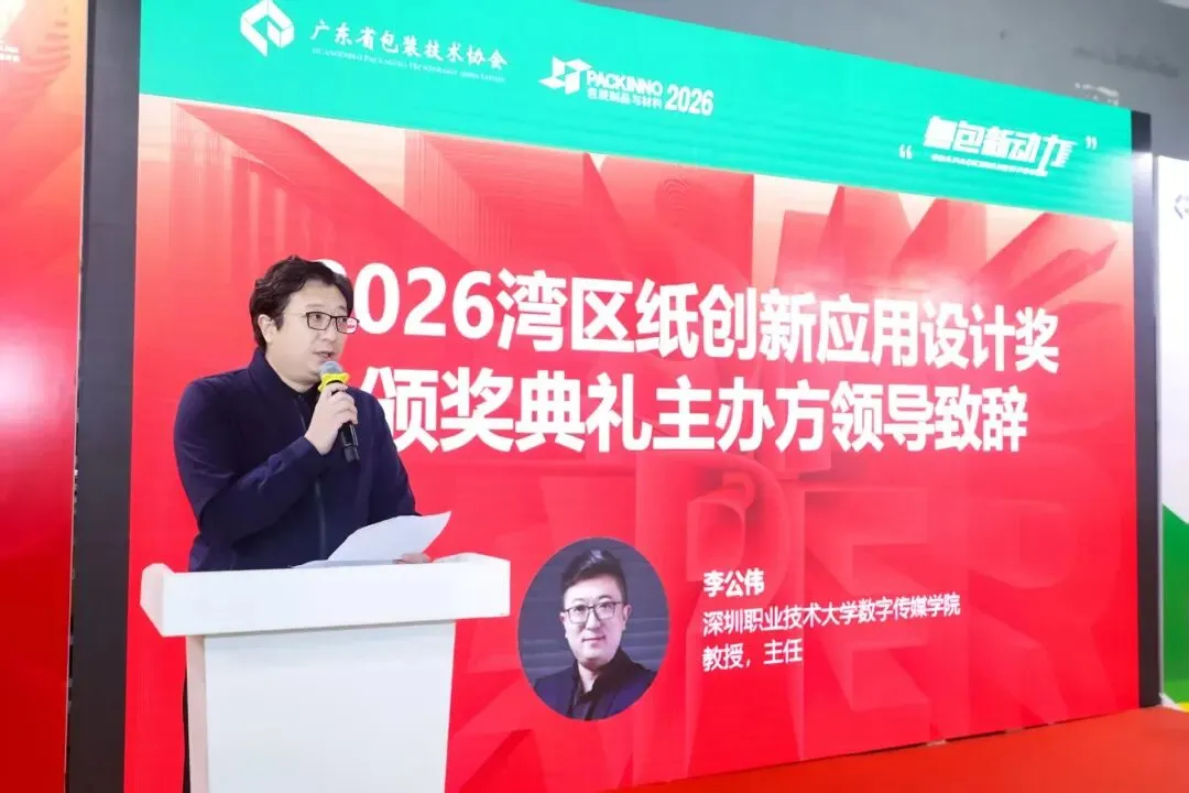 深圳职业技术大学数字传媒学院主任李公伟教授向莅临现场的各位来宾表示热烈欢迎!向所有获奖的设计者、参赛单位致以诚挚祝贺!向付出辛勤努力的评审专家、工作人员,以及关心支持湾区纸创新应用发展的社会各界朋友,致以衷心感谢!同时指出今天的颁奖典礼,是大赛成果的展示,更是湾区纸创新应用产业发展的新起点。我们希望以大赛为桥梁,持续整合全球设计、产业、科技资源,推动优秀作品市场转化,让创意设计真正赋能产业发展,助力“制造湾区”向“创造湾区”迈进。