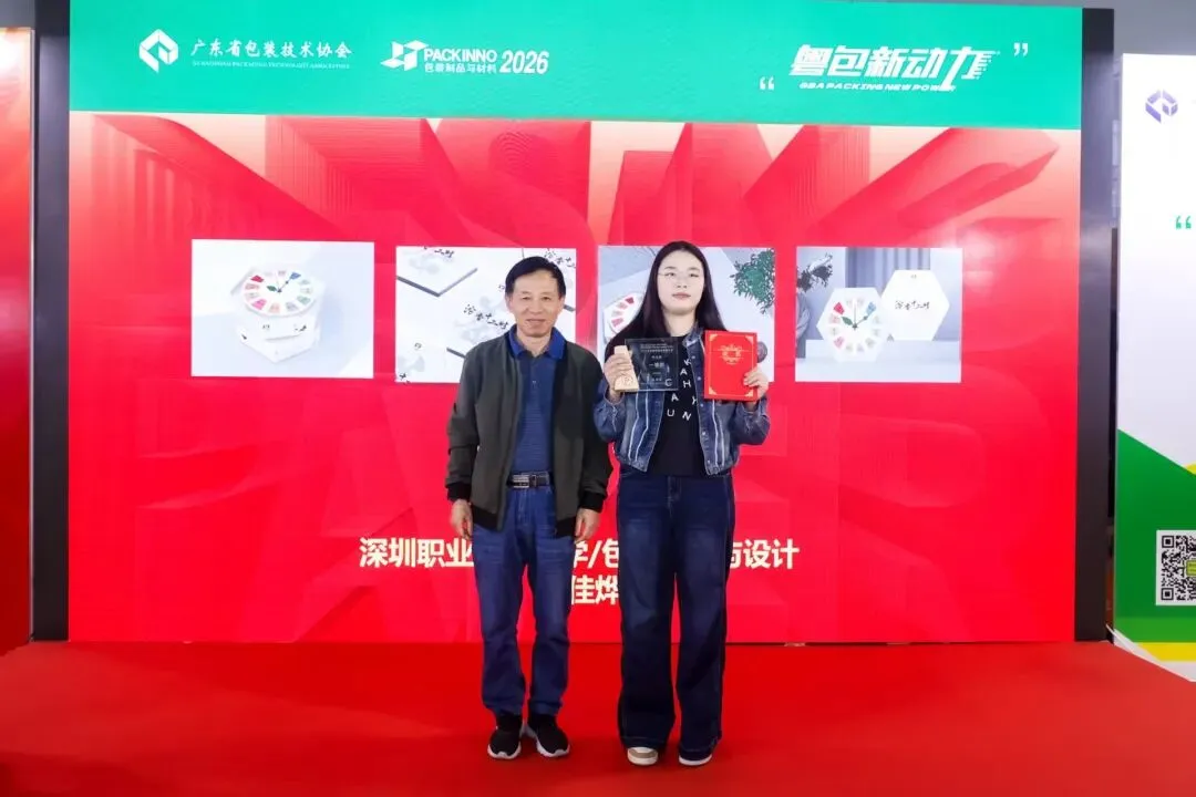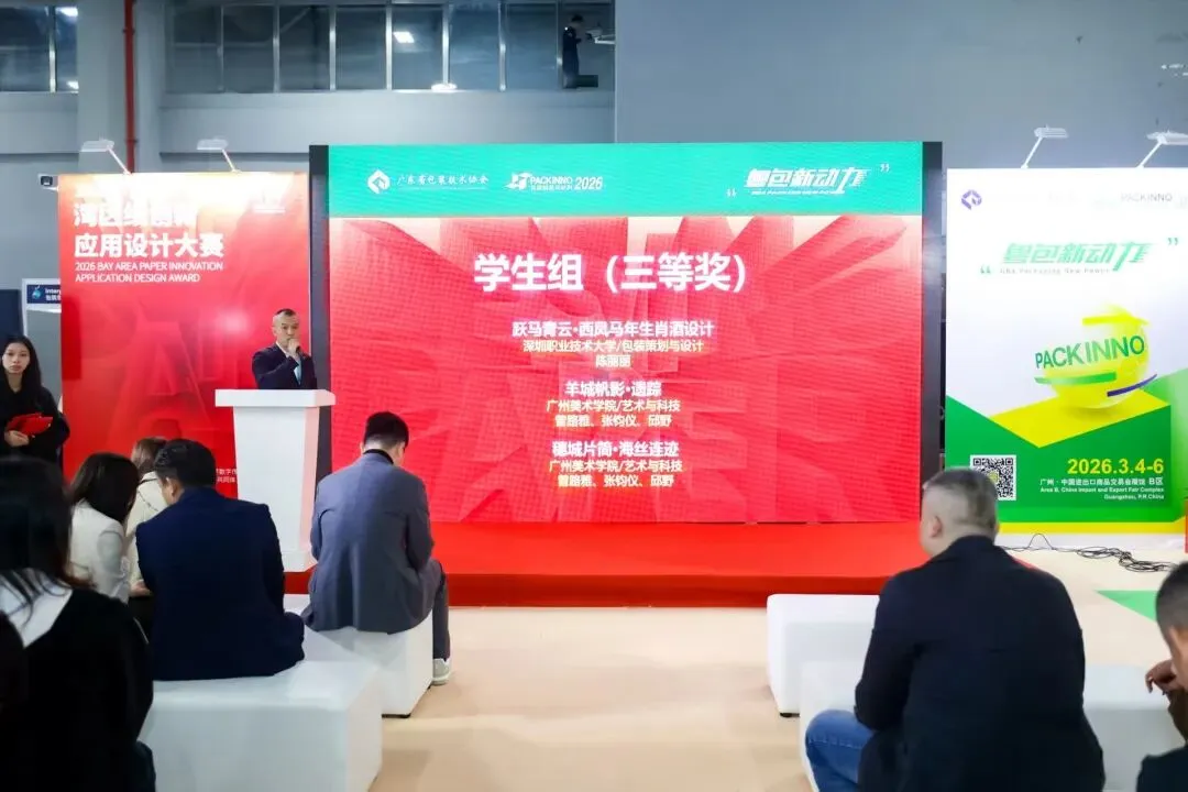 由广东省包装技术协会、深圳职业技术大学数字传媒学院、粤港澳大湾区创新包装产业协作共同体联合主办,雅式展览服务有限公司、广州派设计信息科技有限公司、广东省包装技术协会湾区协同发展分会、广东省包装技术协会用户委员会、广东省包装技术协会创新中心(盒智创新)联合承办的2026湾区纸创新应用设计奖共征集作品280余件,经过专业评审团评审以确认专业组金、银、铜、优秀奖,学生组一、二、三等奖、优秀奖及优秀指导老师奖、优秀组织单位奖。今天上午10:30,颁奖典礼正式拉开帷幕。