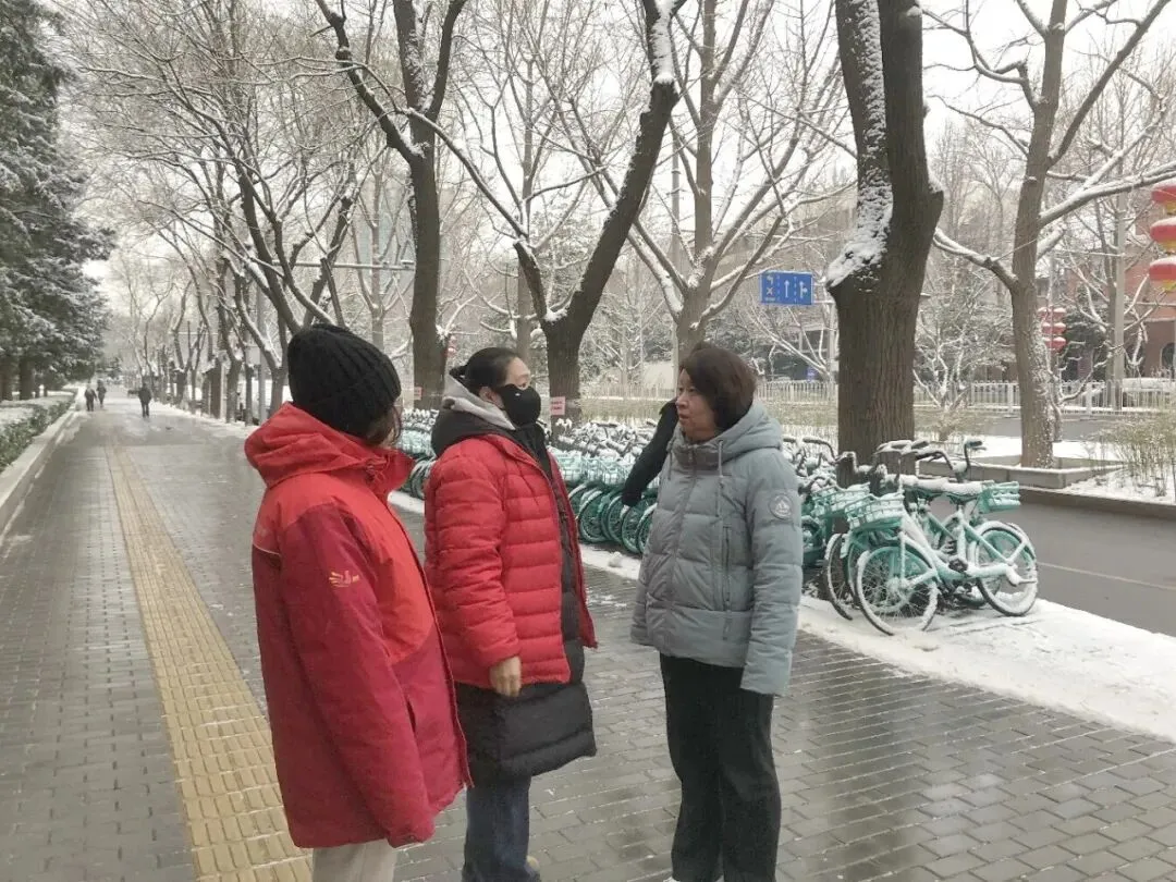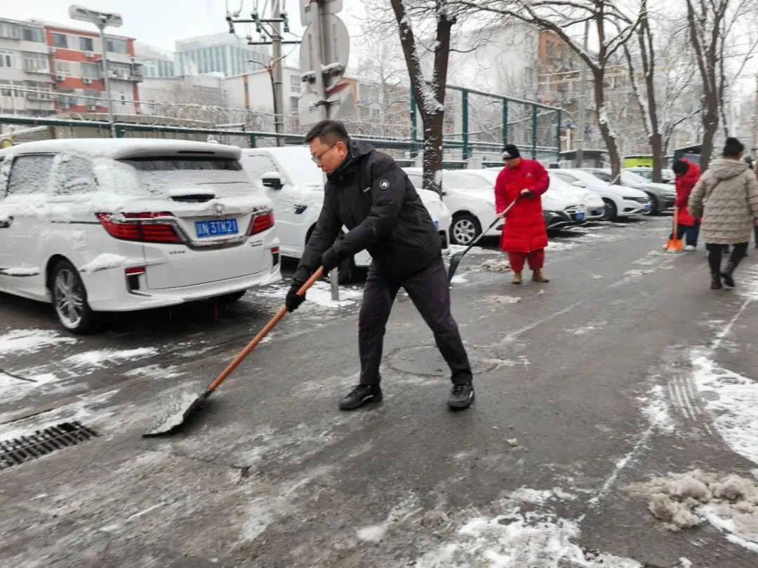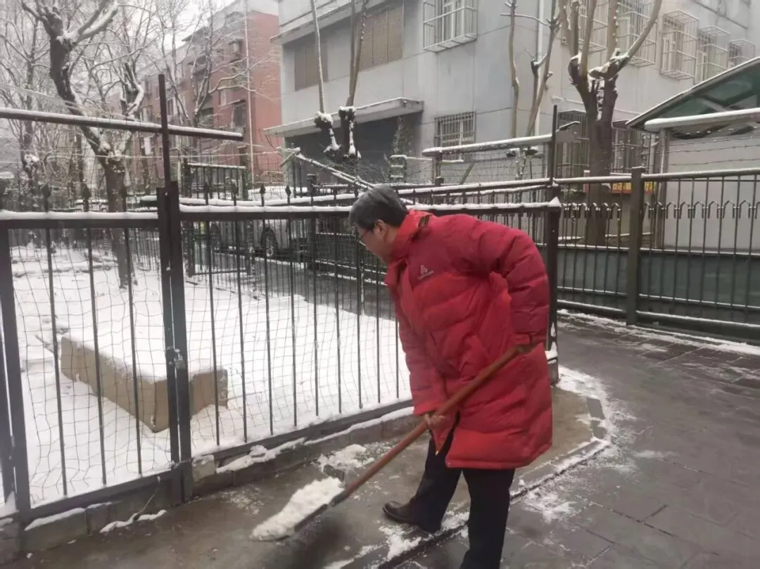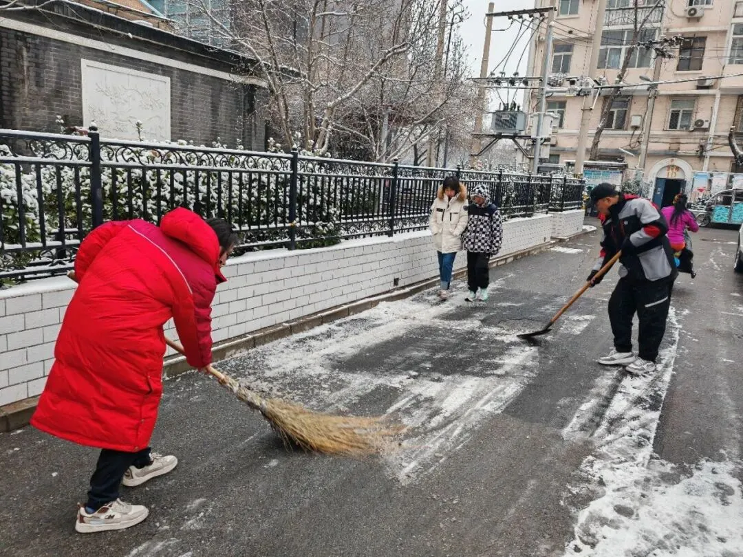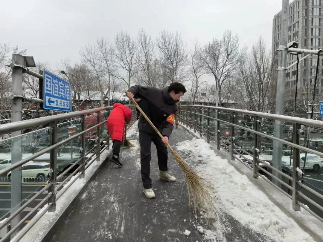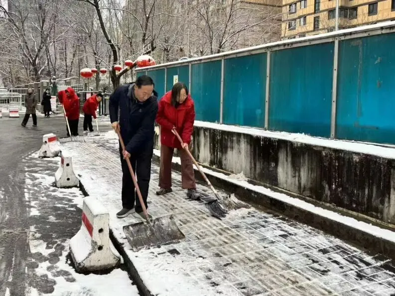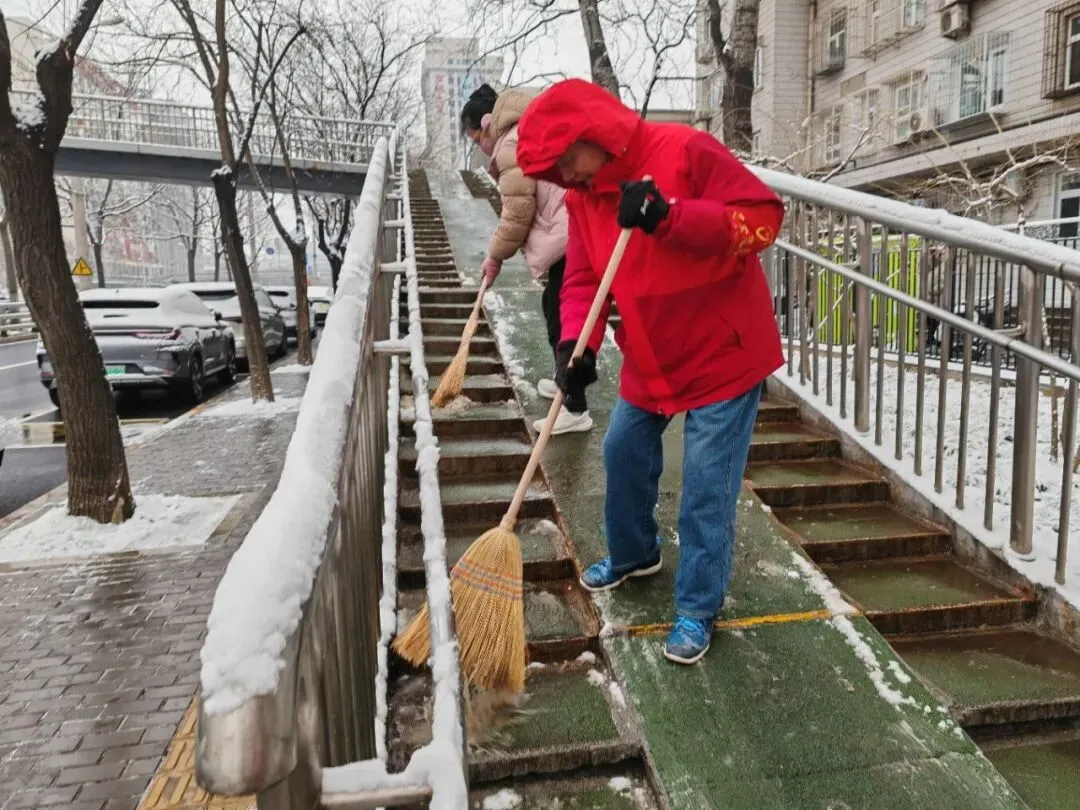 街道处级领导深入各社区,与辖区党员干部、居民群众一同投入保障工作,用行动“融化”冰雪,践行志愿担当。社区工作者身着“志愿红”,用温暖服务抵挡风雪的严寒;地区单位、沿街商户积极践行“门前三包”,不仅“自扫门前雪”,还协助背街小巷、平房院落清除“他人瓦上霜”;还有快递小哥放下手头的工作,参与到扫雪铲冰的行动中来,“为了让街坊邻里出行更安全,我们不怕麻烦和辛苦!”一抹抹志愿红汇聚成最温暖的守护力量,让雷锋精神在风雪中熠熠生辉。