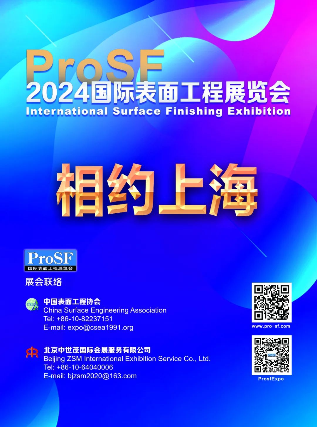 ProSF 2024国际表面工程展览会定于2024年在上海举办,ProSF表面工程论坛、2023年度“中国表面工程协会科学技术奖”颁奖等系列行业展会及活动。届时亦将会是2024年表面工程行业的又一场令人瞩目的盛会。