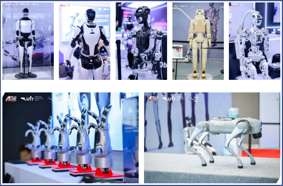 整机集成与解决方案区:呈现工业、服务、特种等各类先进机器人整机,展示其在实际行业中的解决方案。