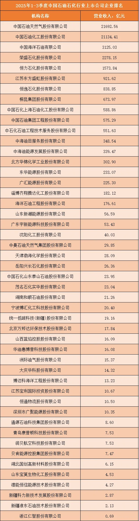 根据申万行业分类,2025年1-3季度中国石油石化行业上市公司按营业收入排名如下:(A股上市公司)
