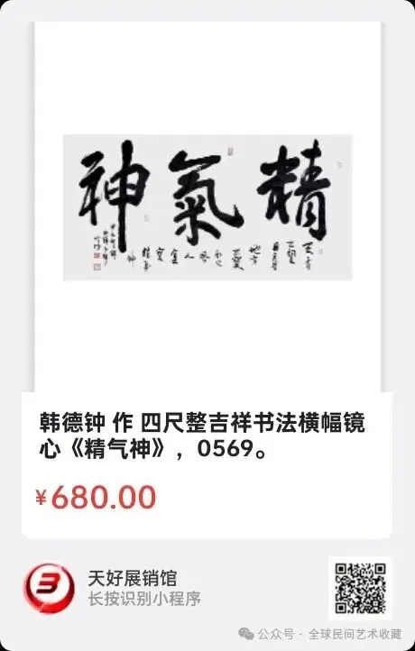 韩德钟 作 四尺整吉祥书法横幅镜心《精气神》,规格尺寸:68X138㎝,材质:宣纸原片,创作时间:2024年。来源0569.V.