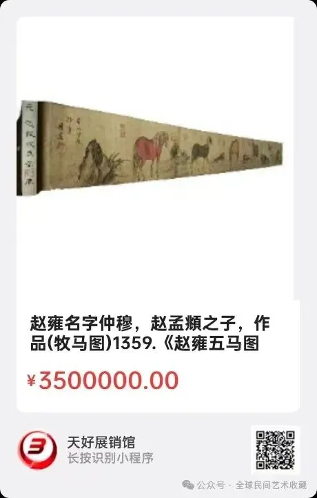 赵雍(1289~1369)名字仲穆,赵孟頫之子,作品(牧马图)《赵雍五马图》远较唐朝画家韩滉的作品(五牛图)格式样图相同造型,黄麻纸本设色画,本幅画大地牧马的景至,马匹结体雄壯,各具状貌姿态互异,从左至右一字排开,五马络首而立,一府首底头吃草荆棵蹭痒,因此每头马可独立成章,结合设色与皴法,加强空间的推衍及层次感,充分地发挥笔墨淋漓尽致,绝世佳作。长度#233厘米。宽度23厘米。来源,1359V。