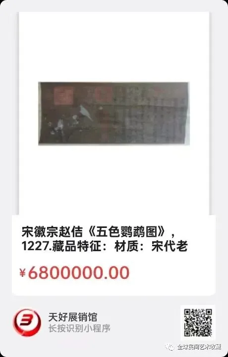 宋徽宗赵佶《五色鹦鹉图》,画心尺寸:约为60cmX28cm,藏品特征:材质:宋代老双丝绢,印章:有宋代“宣和殿宝”、“宣和”、“宣和中秘”、宋徽宗“双龙印”…有清代宫廷印章“乐寿堂”、“宜子孙”、“乾隆御玩”、“三希堂精鉴玺”等宋徽宗落款:御制御画并书天下一人,宋徽宗瘦金体题诗。可议价。来源:1227.V。