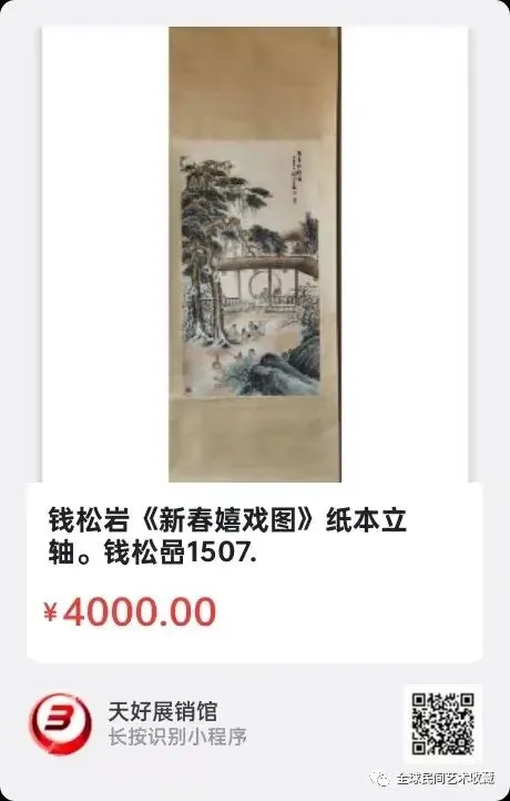钱松岩《新春嬉戏图》纸本立轴。长67厘米,宽35厘米。钱松喦(1899~1985),1899年 9月11日生于江苏省宜兴县杨巷镇湖墅村,1985年9月4日卒于江苏省南京市。又名松岩、松喦,40年代曾用名喦庐主人。是当代中国美术、中国山水画的代表人物之一,新金陵画派的领军人物,其代表作品被认为是重要的江南文化符号。 曾任第四、五、六届全国人民代表大会代表、江苏省人大常务委员、中国文联委员、中国美术家协会常务理事和艺术顾问、江苏美协名誉主席,1977年任江苏国画院院长,后任名誉院长。来1507。V.