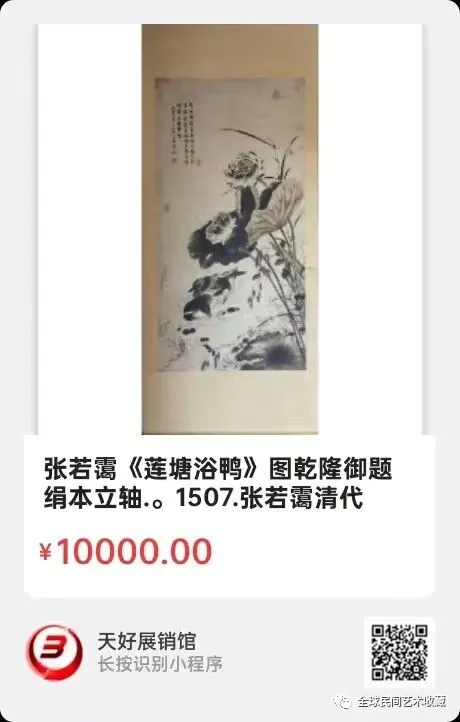 张若霭《莲塘浴鸭》图乾隆御题绢本立轴.。长132厘米,宽67厘米。张若霭(1713-1746),清代画家,字晴岚,室名藕香书屋,安徽桐城人。他在世时间很短,仅仅活了34岁,英年早逝,所以声名渐淡。但他家世显赫,祖父张英、父亲张廷玉均为雍正、乾隆朝大学士。特别是他的父亲张廷玉(1672-1755)历经康熙、雍正、乾隆三朝,乃国之重臣,是整个大清朝唯一个配享太庙的汉臣。张若霭不是睡在父辈功劳簿上的官二代,他天资聪慧,辛勤苦读,才华卓绝,雍正十一年(1733)癸丑科殿试金榜中二甲一名进士。来1507。V.