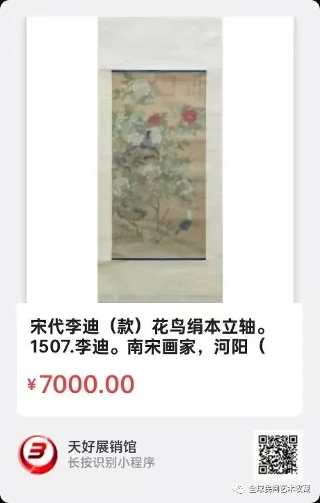 宋代李迪(款)花鸟绢本立轴。长87厘米,宽41厘米。李迪( 1100 ~ 1197 [2] )。南宋画家,河阳(今河南省孟州市)人,工花鸟竹石、鹰鹘犬猫、耕牛山鸡,长于写生,间作山水小景。构思精妙,功力深湛,雄伟处动人心魄。所作《枫鹰雉鸡图》形象生动超拔,《鸡雏图》温柔娇嫩可爱,刻画细致入微,各具神态。山水师李唐法,亦多佳作。来源1507。V.